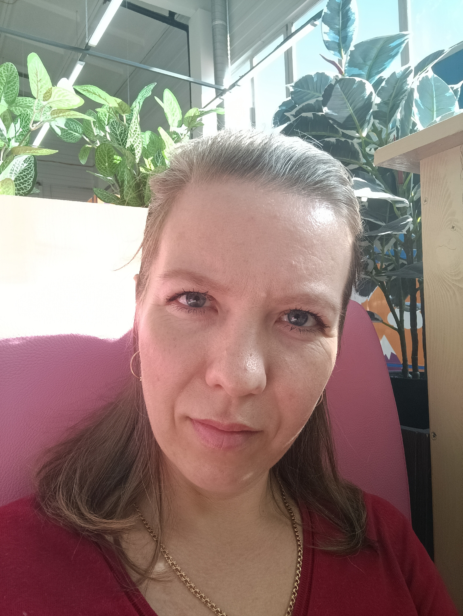 A woman with fair skin and blue eyes is facing the camera. She has blonde hair, styled back, and is wearing a red v-neck shirt and a gold chain necklace. A small gold hoop earring is visible in her leβ¦read more