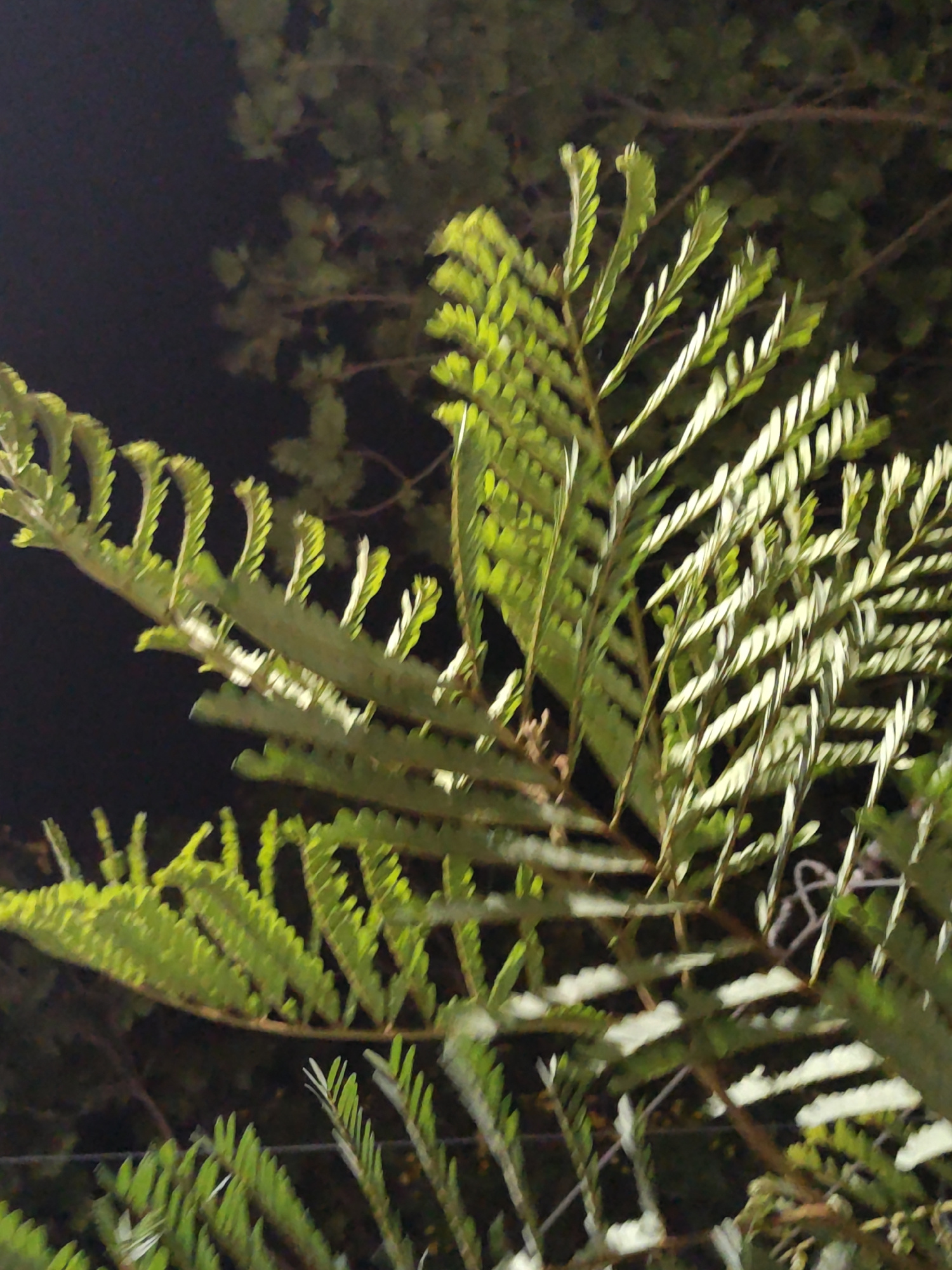 The image presents a close-up view of fern-like foliage, brightly lit against a dark background. The finely divided leaves are a vibrant green, with the lighting accentuating their intricate structure…read more
