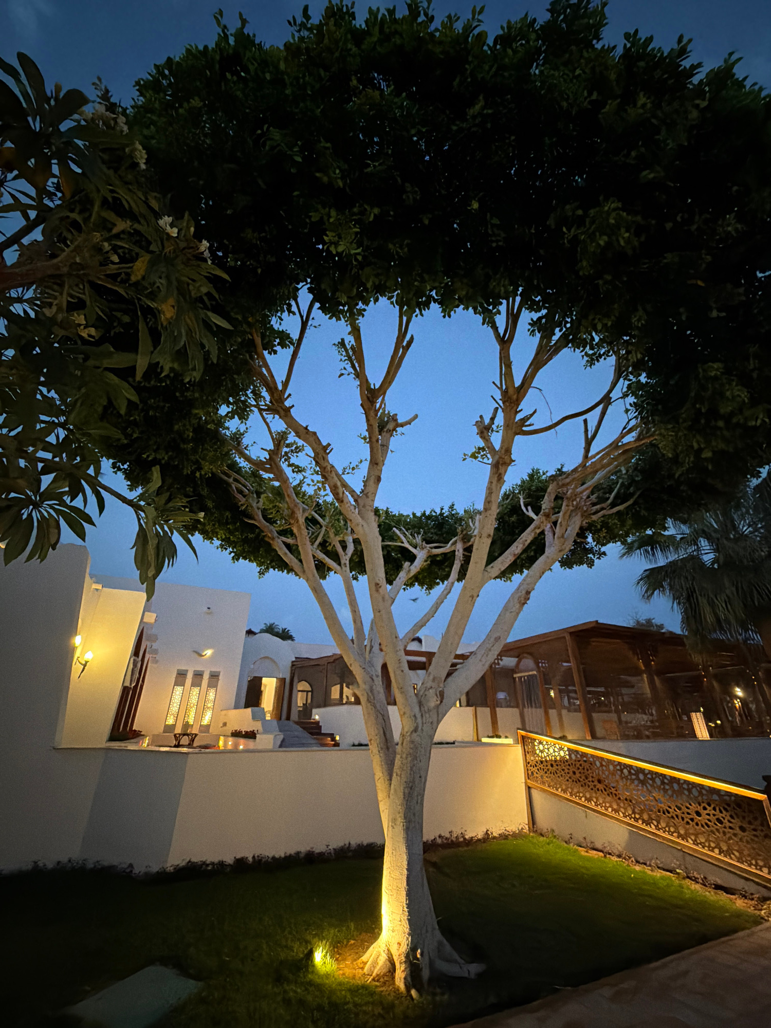 A nighttime scene shows an exterior view of buildings and greenery, likely within a hotel or resort in Sharm El Sheikh, Egypt. The image is slightly rotated, making the buildings appear tilted. A larg…read more