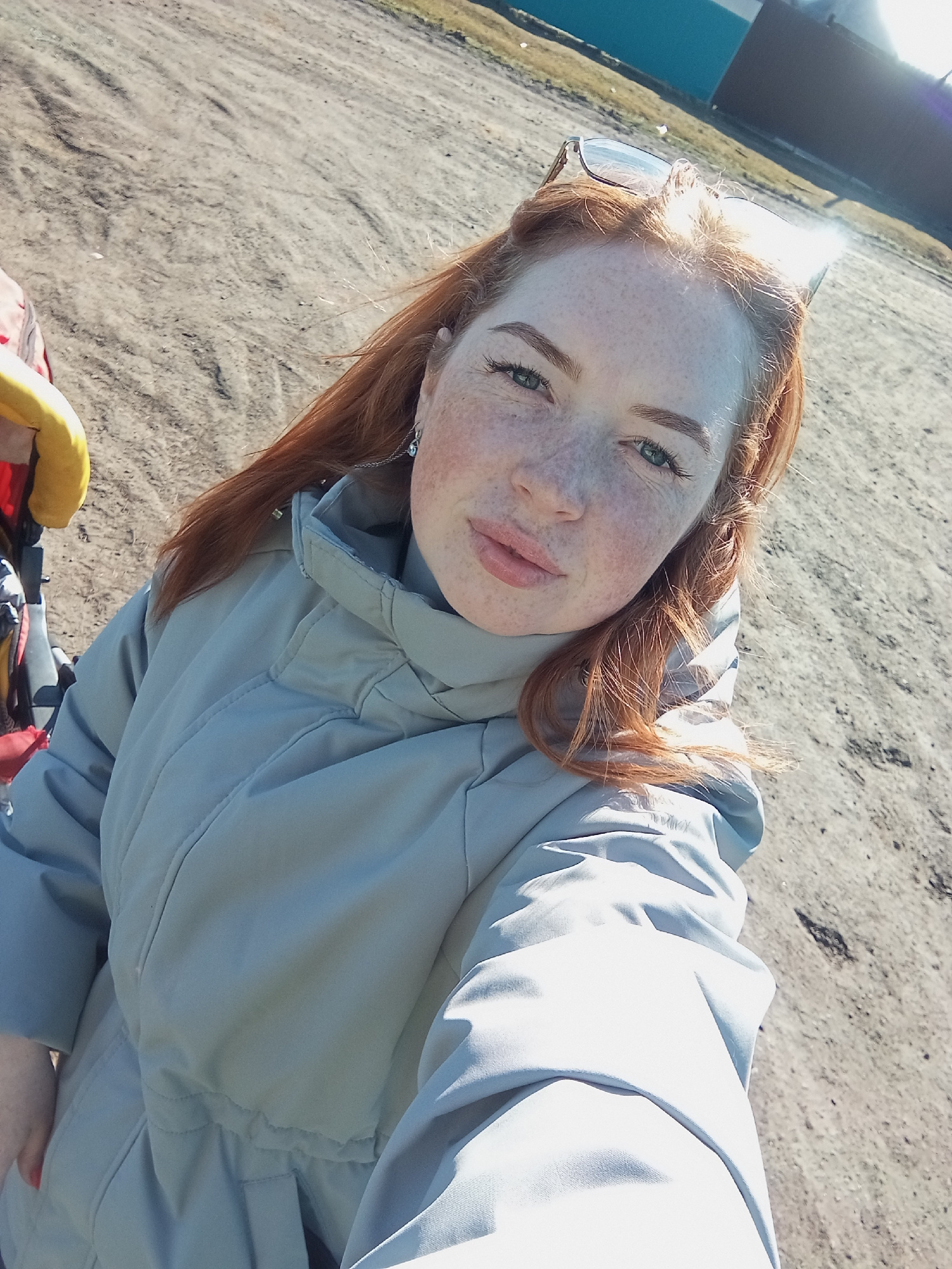 The image depicts a fair-skinned woman with red hair and freckles lying on a surface that appears to be sandy or dirt. She is wearing a light blue coat. A chain necklace is visible. Sunglasses are nea…read more
