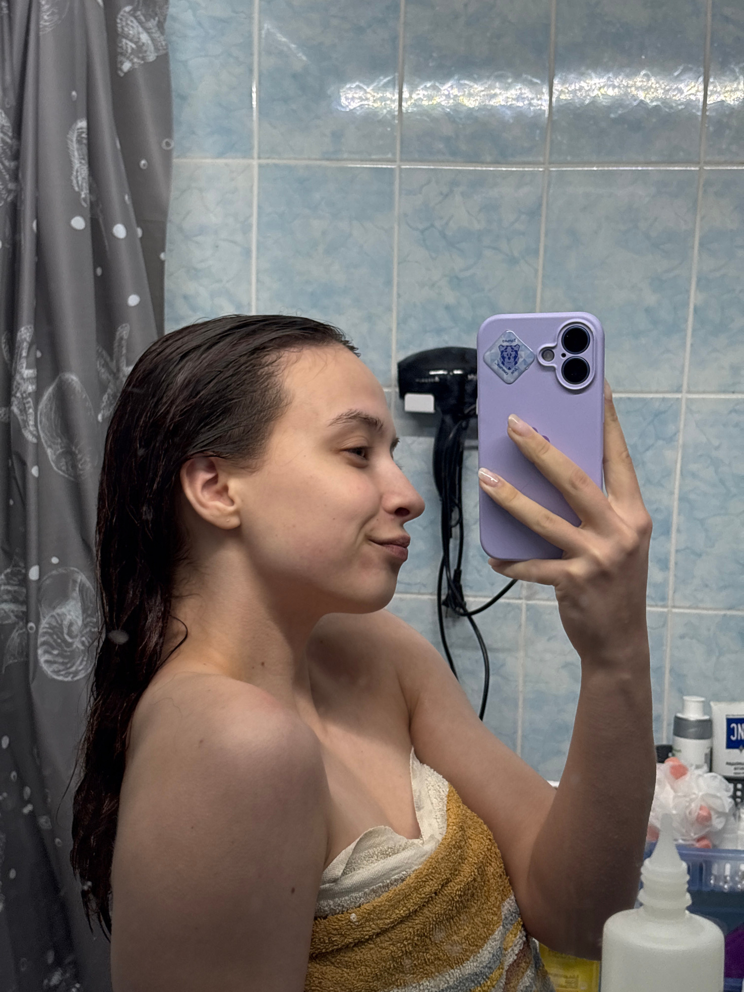 A woman with wet, dark brown hair is taking a selfie in a bathroom with blue tiled walls. She is holding a purple phone in her right hand, which is slightly extended. The phone has a sticker on the ba…read more