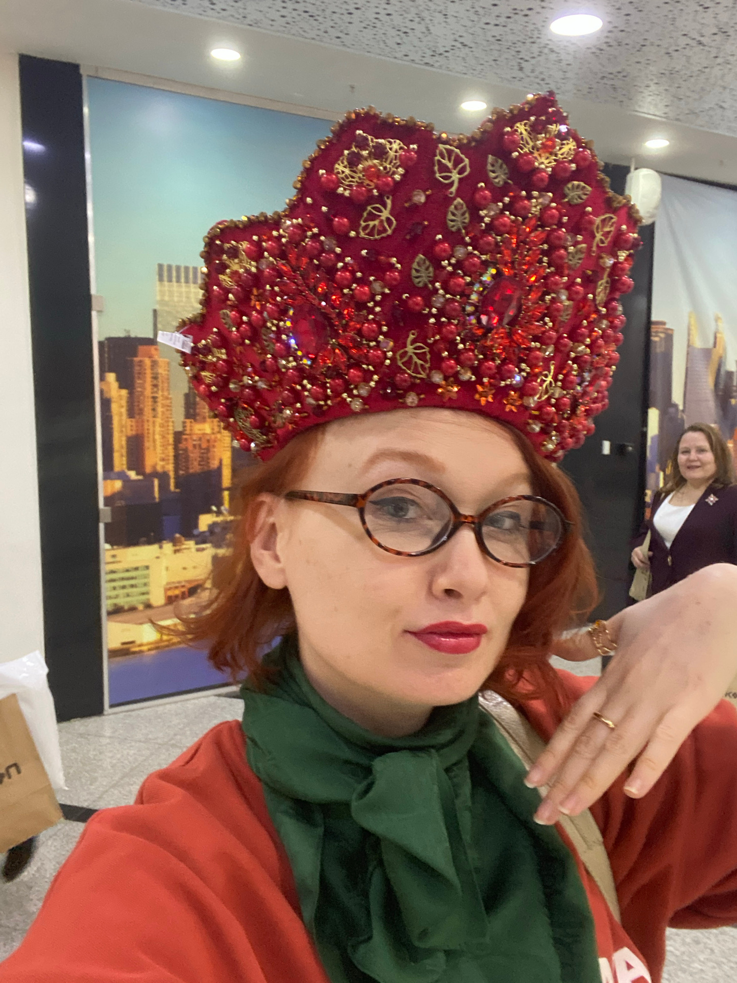 The image is a selfie-style portrait featuring a woman in the foreground, facing the camera. She has reddish-brown hair and wears round, tortoiseshell-patterned glasses. Her lips are accentuated with…read more