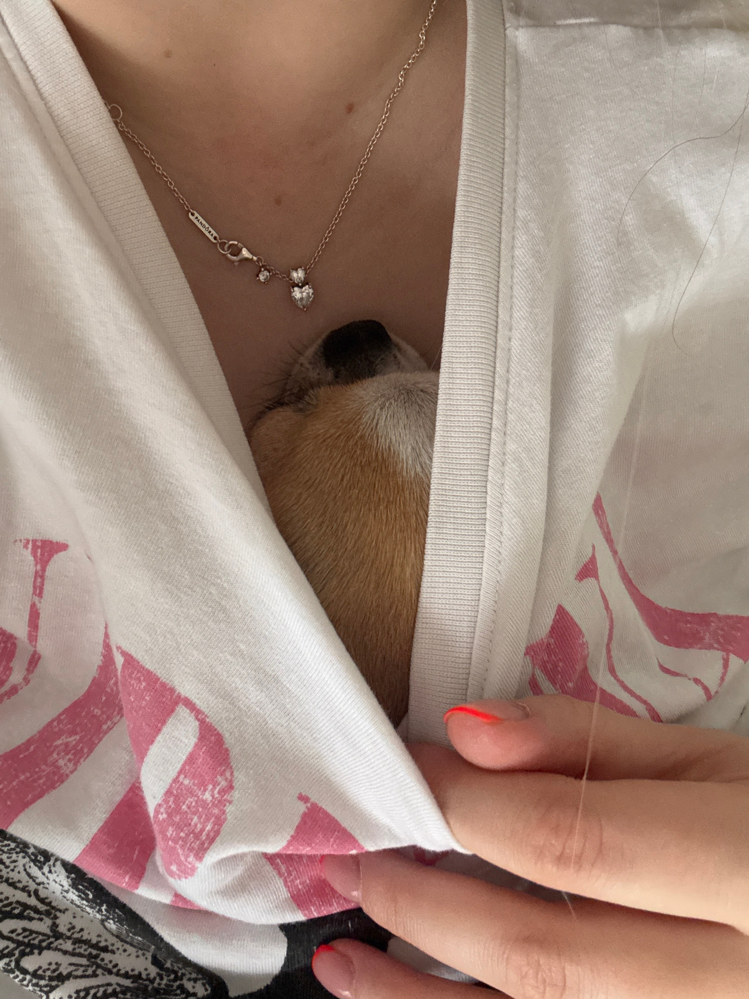 A close-up shot depicts a person wearing a white t-shirt with pink designs. A small dog, appearing to be a Chihuahua, is nestled inside the t-shirt, with only its nose and part of its head visible. A…read more