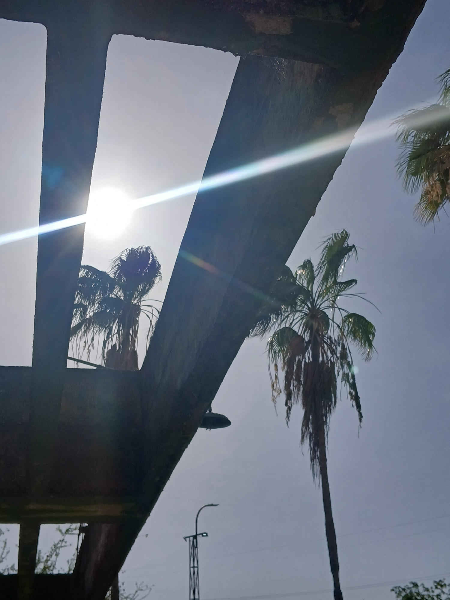 The image, shot from a low angle, showcases a dilapidated concrete structure, possibly an abandoned building, framing a view of palm trees against a bright sky. The sun's glare creates a strong lens fâŚread more