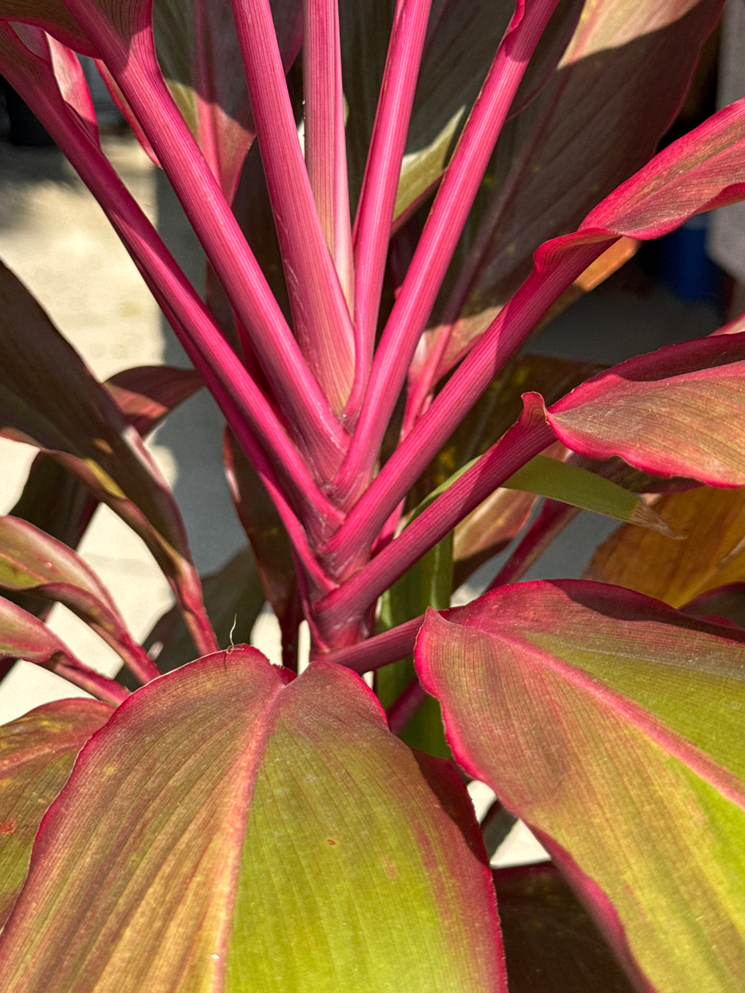 A close-up shot features the vivid pink stems and leaves of a plant, likely a Cordyline fruticosa, under natural lighting. The leaves display a gradient of colors, ranging from green and brown to redβ¦read more