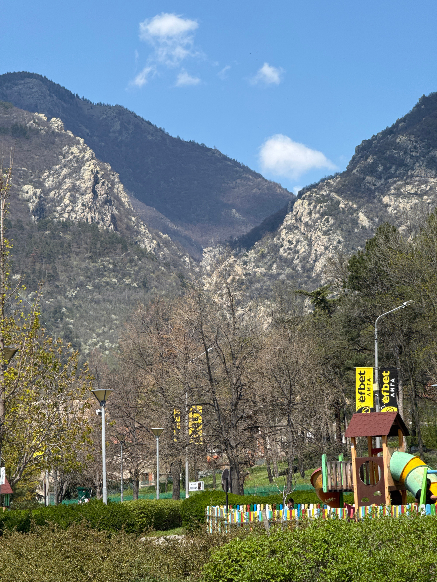 The image depicts a mountain landscape juxtaposed with a townscape, likely in Karlovo, Bulgaria, judging by the signage "efbet" in Cyrillic. A rocky mountain range dominates the left side of the image…read more