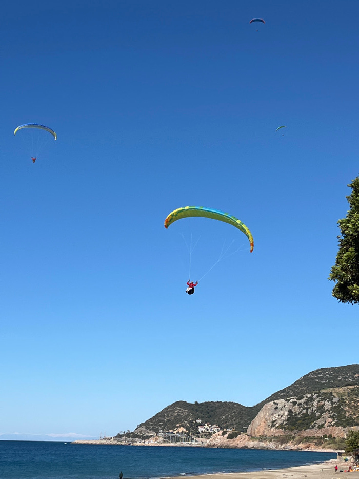 The scene depicts a coastal area in Alanya, Turkey, under a clear, cloudless blue sky. Four paragliders are airborne. The most prominent paraglider, centrally located in the mid-ground, features a mul…read more