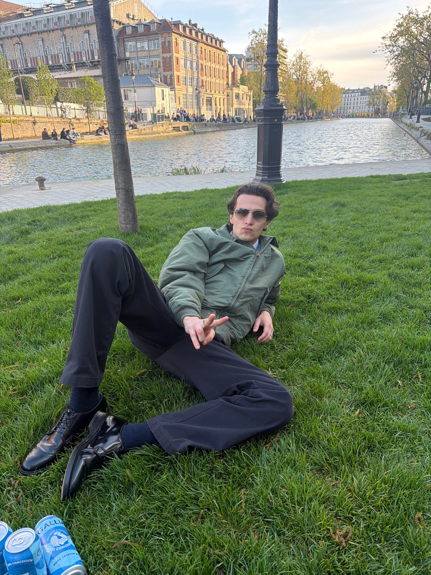 The scene depicts a young man reclining on a grassy lawn in Paris, France. He is wearing a green bomber jacket, dark trousers, black socks, and polished black shoes. He is also wearing sunglasses and…read more