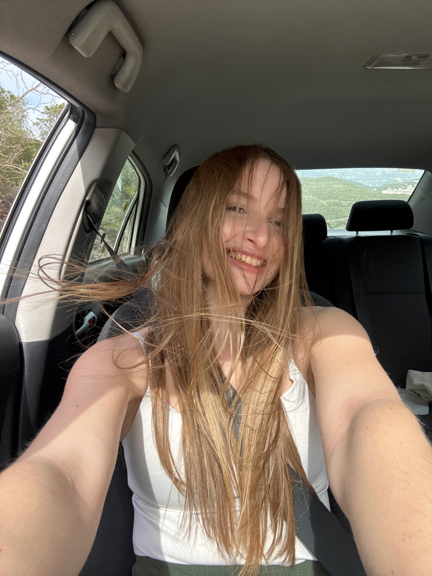 A woman with long, light brown hair is smiling inside a car. She is wearing a white tank top and a seatbelt. The car's interior is visible, including the seats, dashboard, and windows. Outside the car…read more