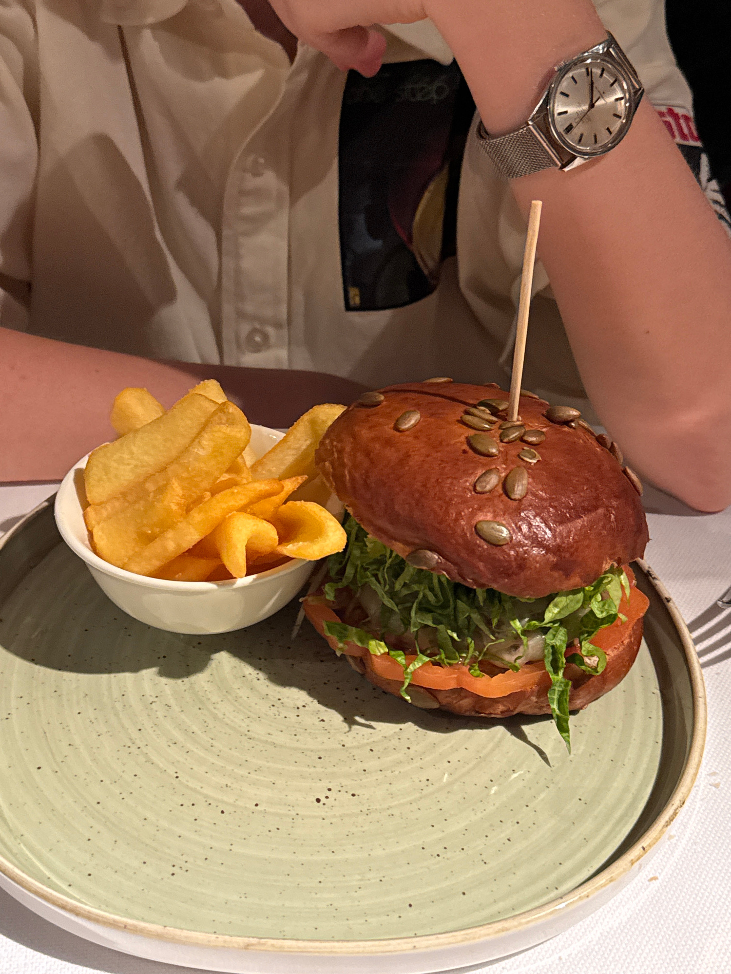 A high-angle, medium shot depicts a light brown, seeded bun sandwich filled with lettuce and what appears to be salmon or smoked salmon, resting on a green-speckled plate alongside a small white ramek…read more