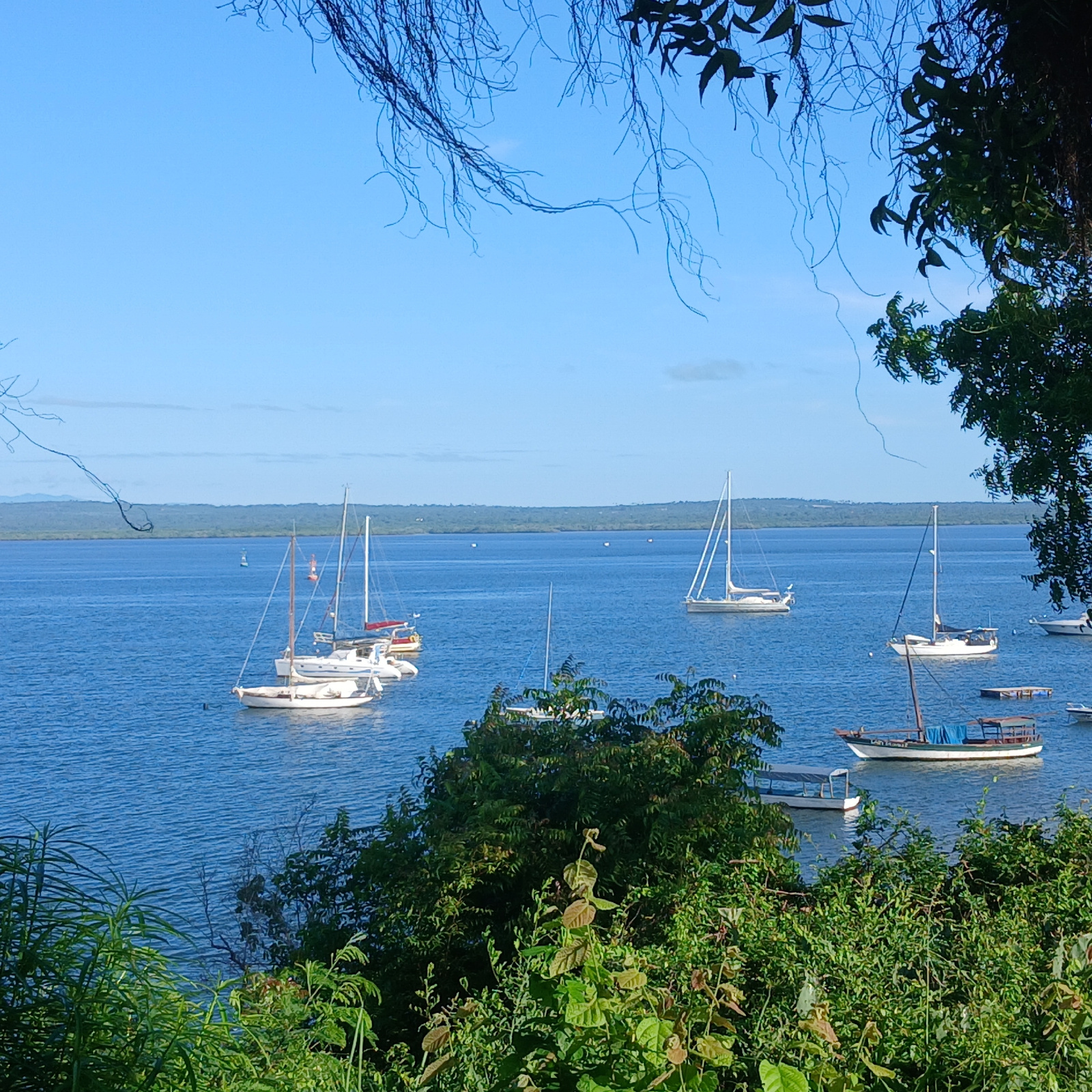 The image depicts a daytime view of a harbor or bay in Tanga, Tanzania, observed from an elevated, vegetated vantage point. Dense green foliage, comprising branches and leaves, frames the scene in the…read more