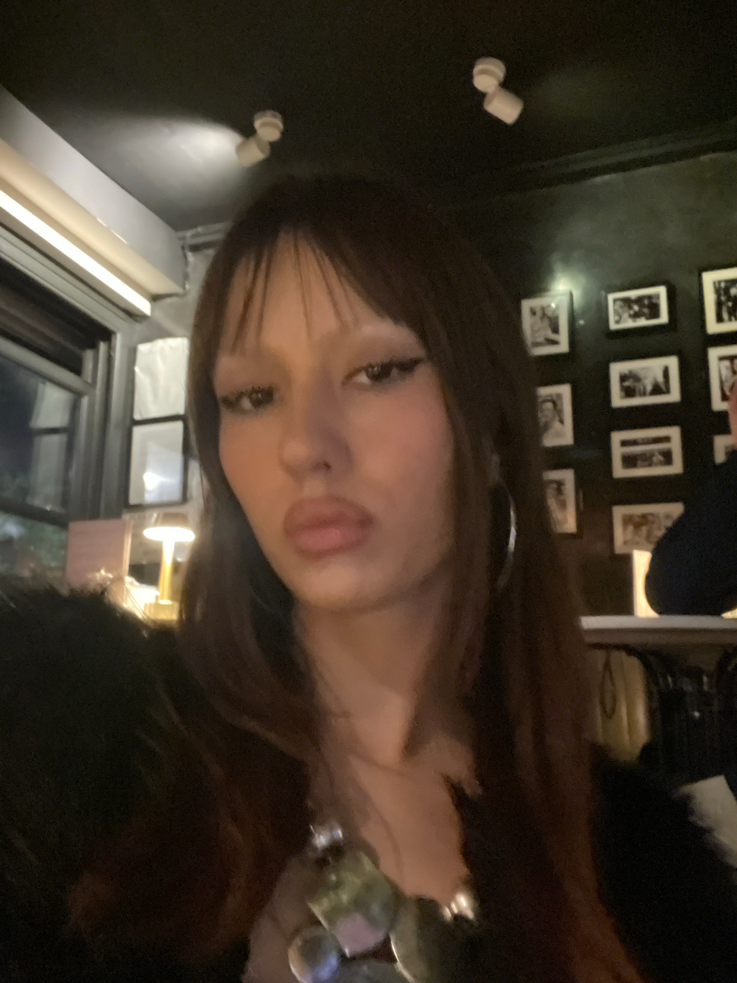 The image shows a selfie of a young woman with dark brown hair and bangs. She is wearing a dark-colored furry garment and a necklace with large, possibly metallic, beads. She has makeup on, including…read more
