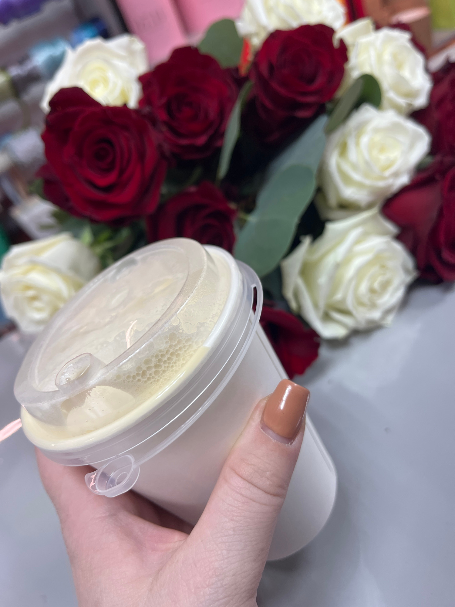 A hand is holding a white plastic cup with a clear lid, likely containing a beverage, against a backdrop of red and white roses. The scene is set on a grey surface, possibly a table. The person's fing…read more