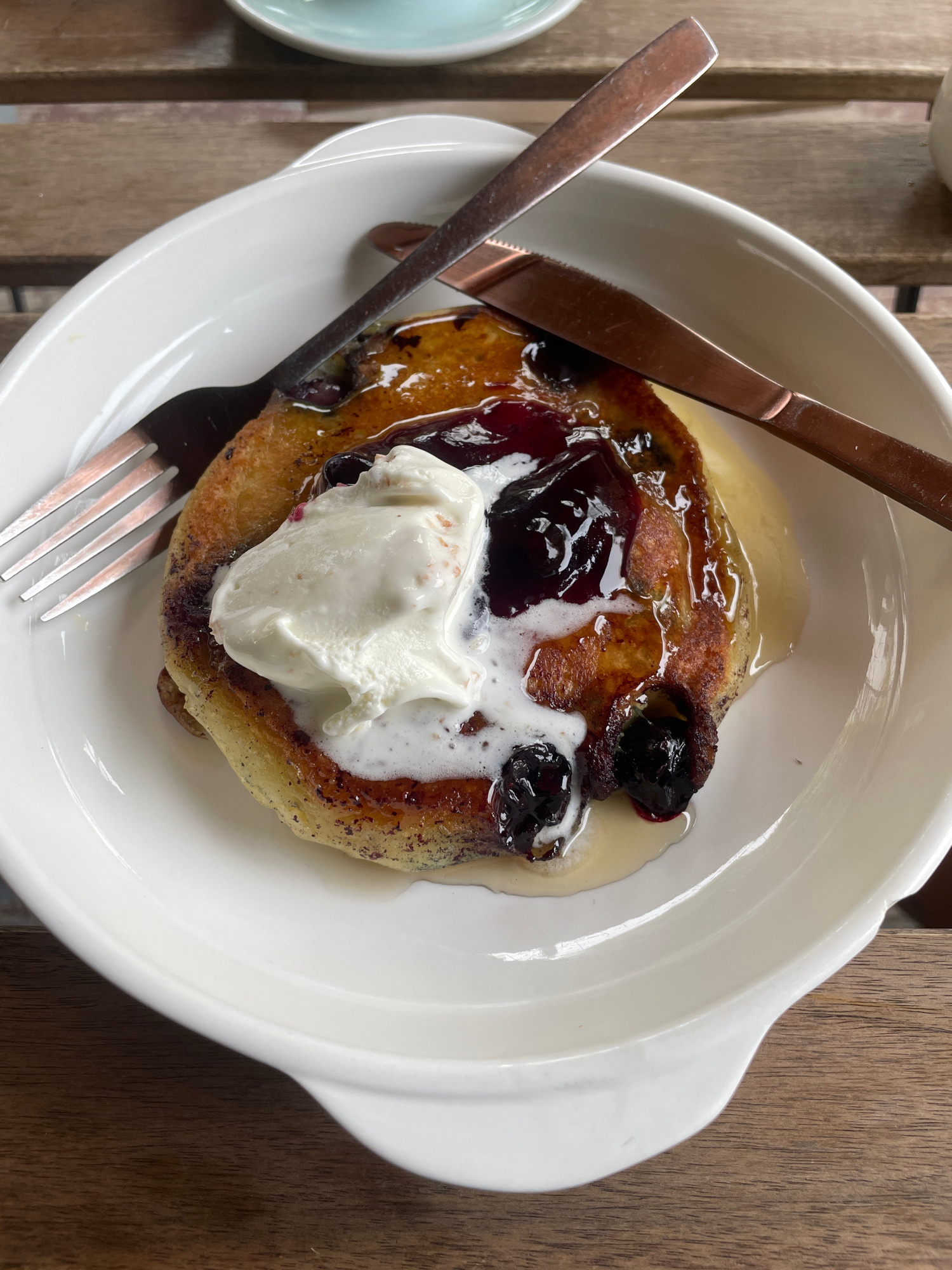 An overhead shot captures a single serving of a dessert or breakfast dish presented in a white ceramic bowl with small handles, resting on a slatted wooden table. The central subject is a golden-brownβ¦read more