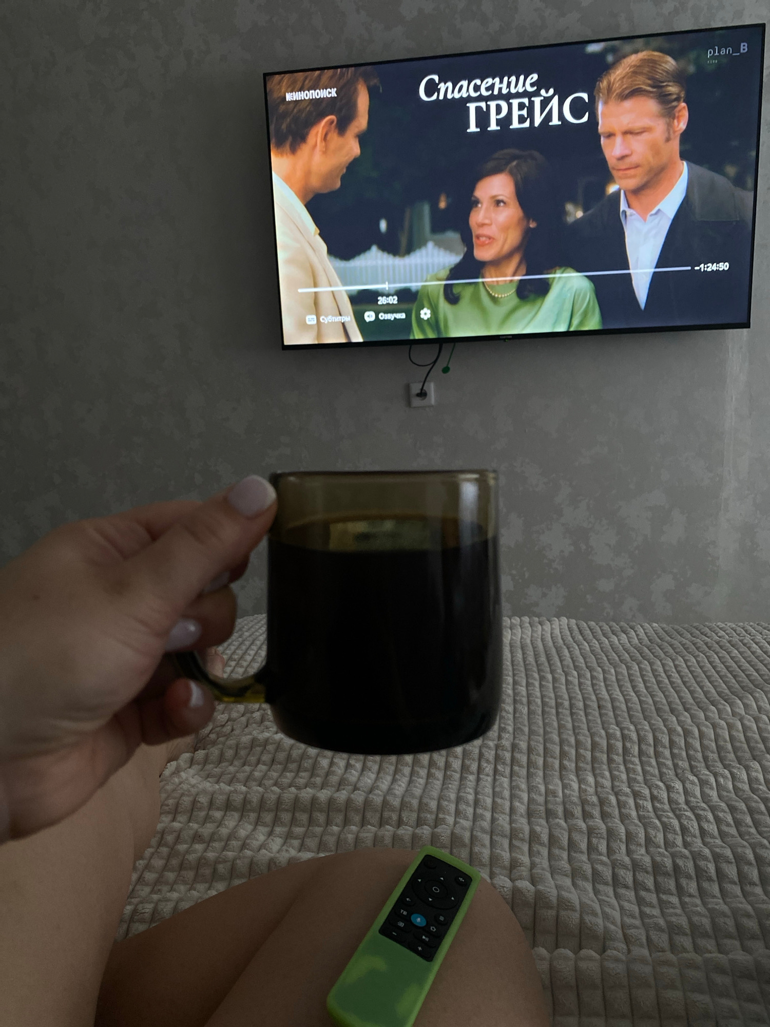A medium shot, taken from the perspective of someone sitting on a sofa, shows a person's hand holding a dark-colored mug in front of a television screen. The TV is displaying a movie titled "Спасение…read more