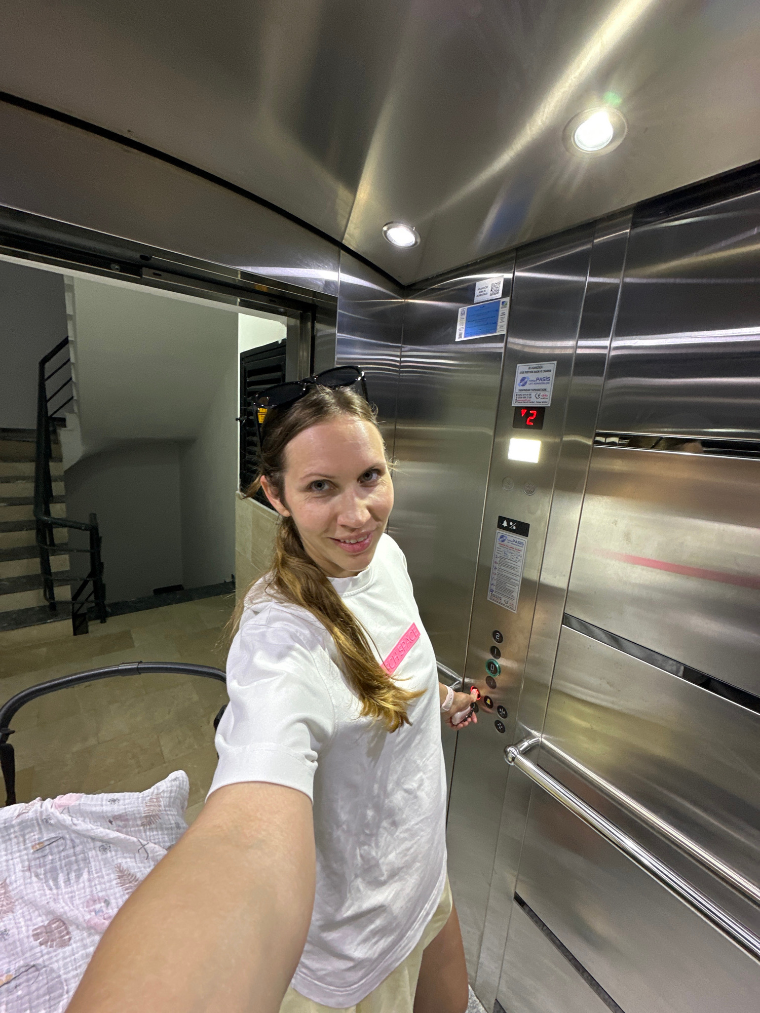 A woman takes a selfie in an elevator. The elevator's interior is stainless steel, illuminated by recessed lights in the ceiling. The display panel indicates the elevator is on the 2nd floor. Buttons…read more