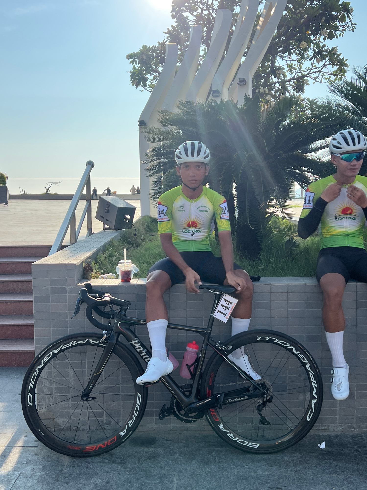 Two cyclists in matching green and yellow jerseys, helmets, white socks, and white shoes are resting next to a black bicycle near a waterfront in Nha Trang, Vietnam. The cyclist in the foreground is s…read more