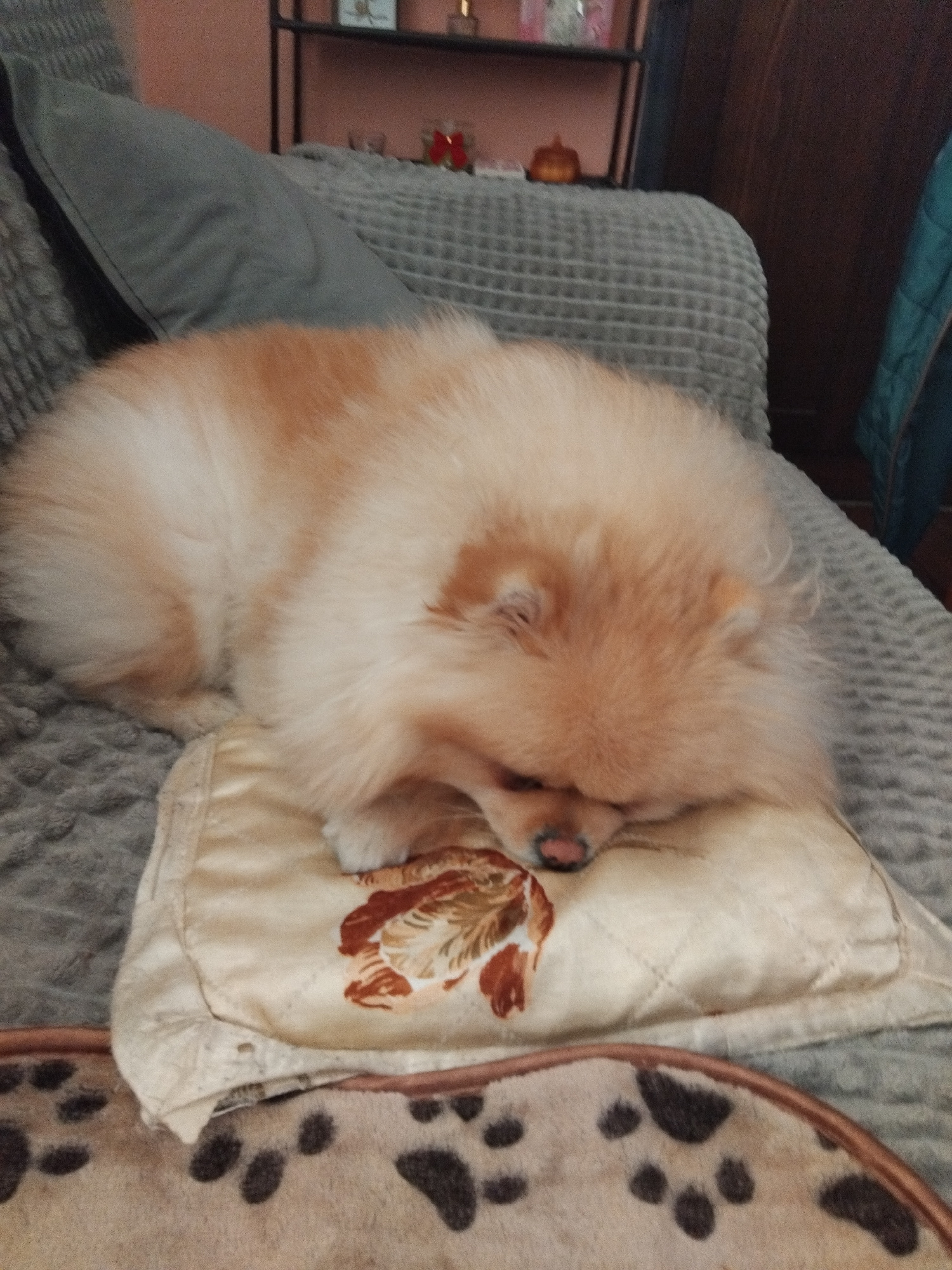 A tan and white Pomeranian dog is curled up and sleeping on a bed or couch. The dog is resting its head on a patterned beige pillow. The background includes a gray textured blanket, a blue object out…read more