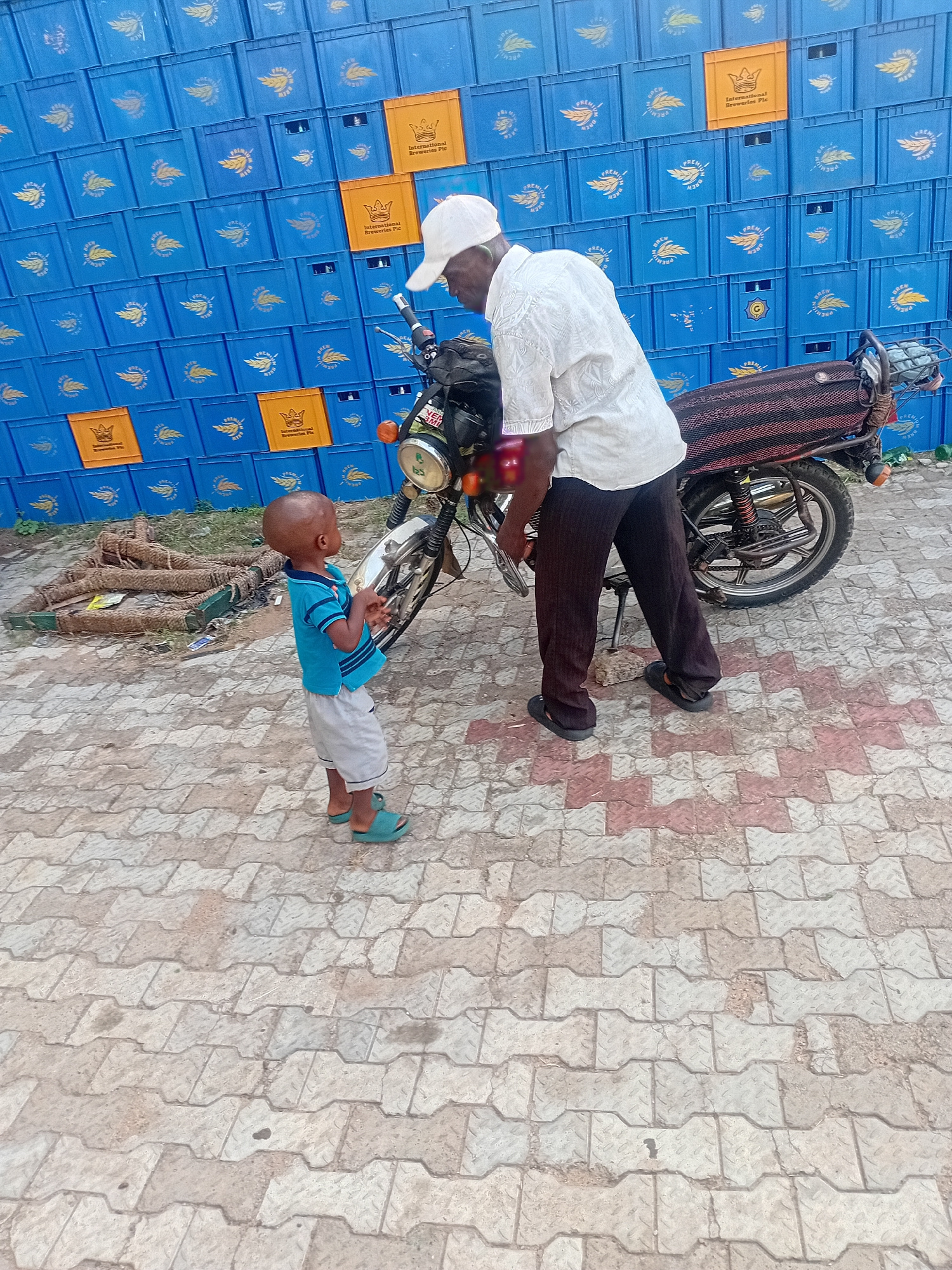 This outdoor image, captured in Lokoja, Nigeria, features an adult male, a young child, and a motorcycle set against a backdrop of stacked beverage crates. The adult, dressed in a white long-sleeved s…read more