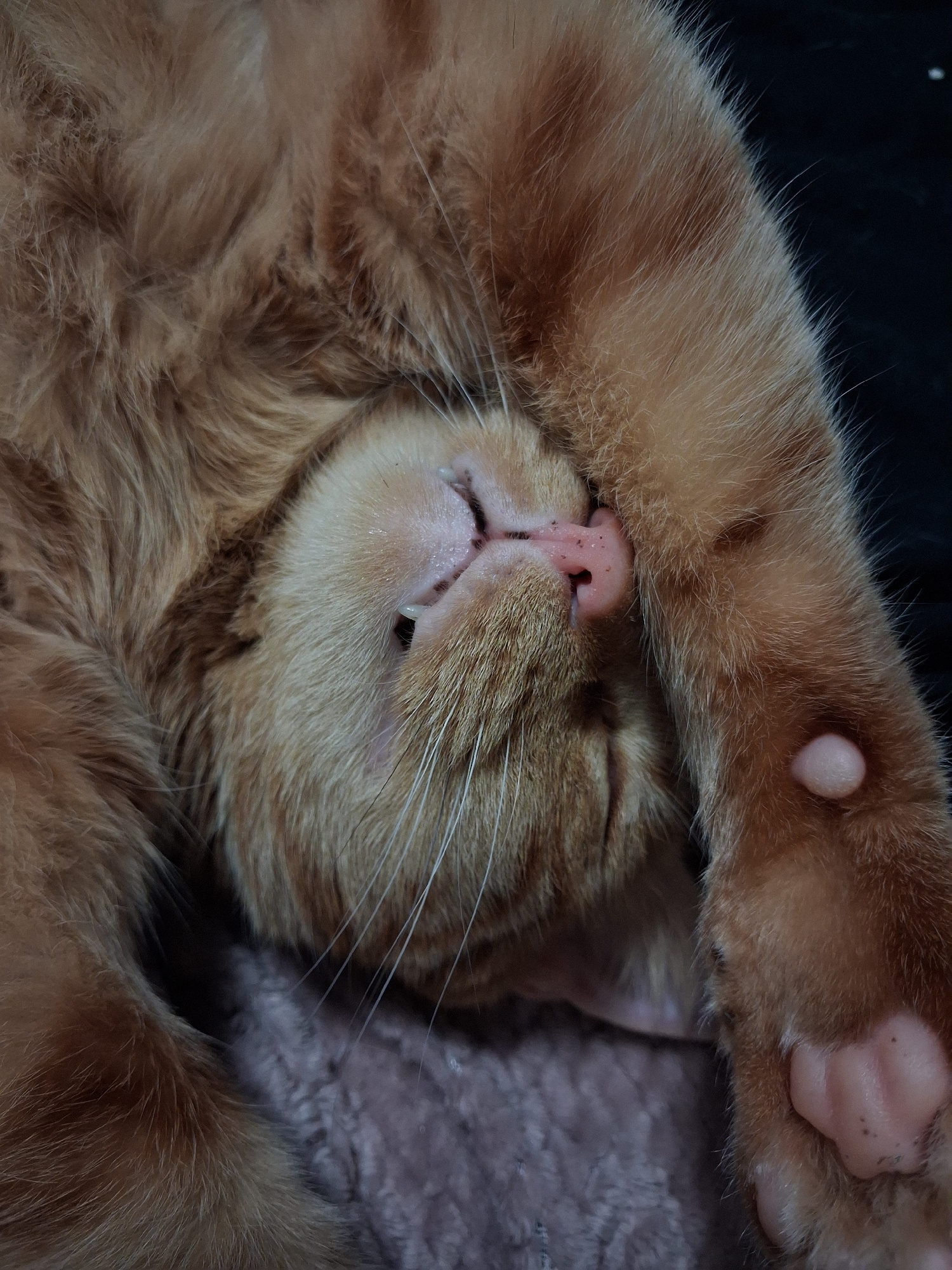 A close-up photograph captures a sleeping ginger cat. The cat is curled up with its paw covering its eyes, revealing soft pink paw pads. The cat's face is visible, showing closed eyes, a pink nose wit…read more