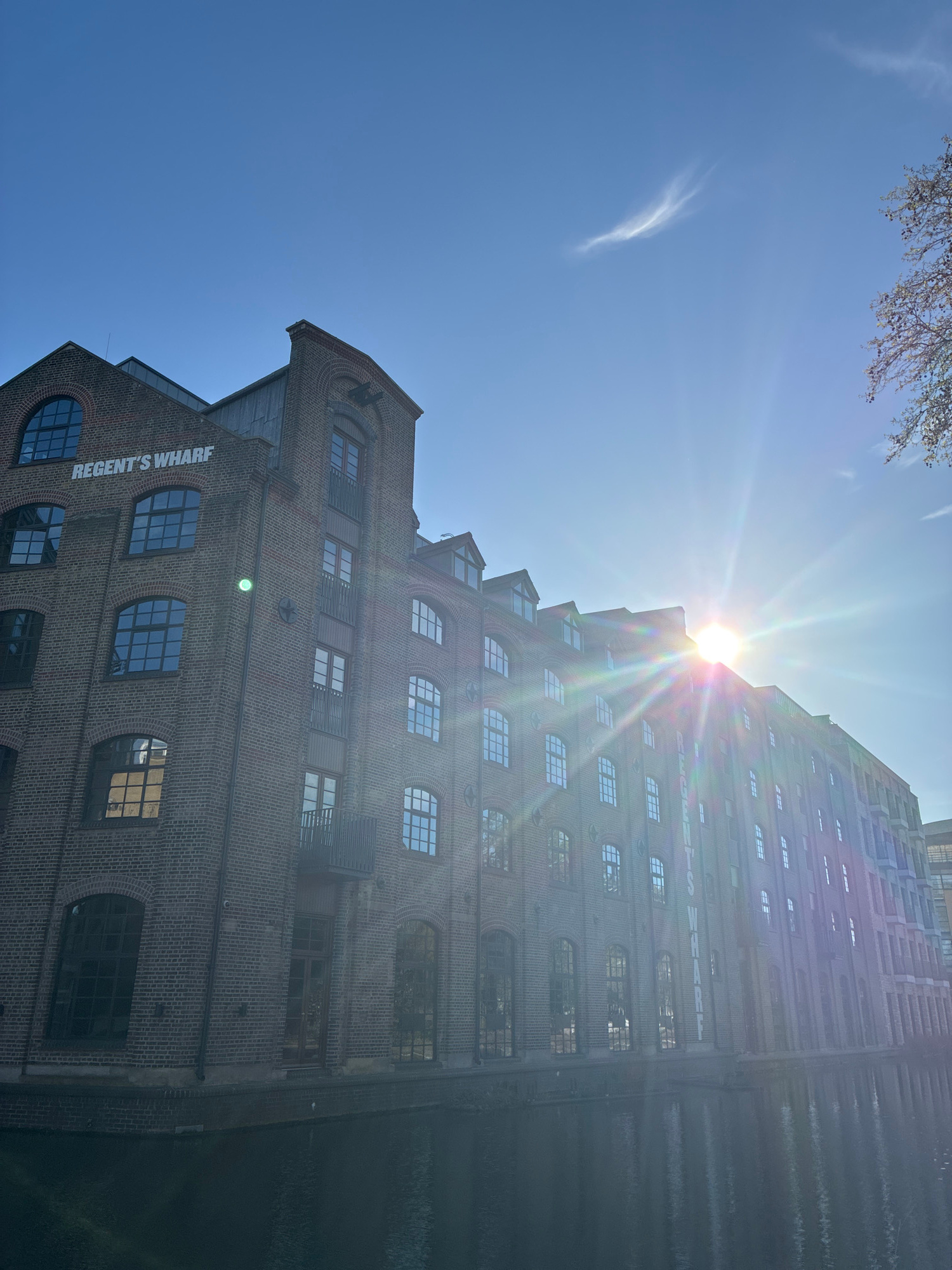 The image shows a low-angle view of Regent's Wharf in London, United Kingdom, a multi-story brick building with numerous windows and rounded arches. The building is situated under a bright blue sky wi…read more