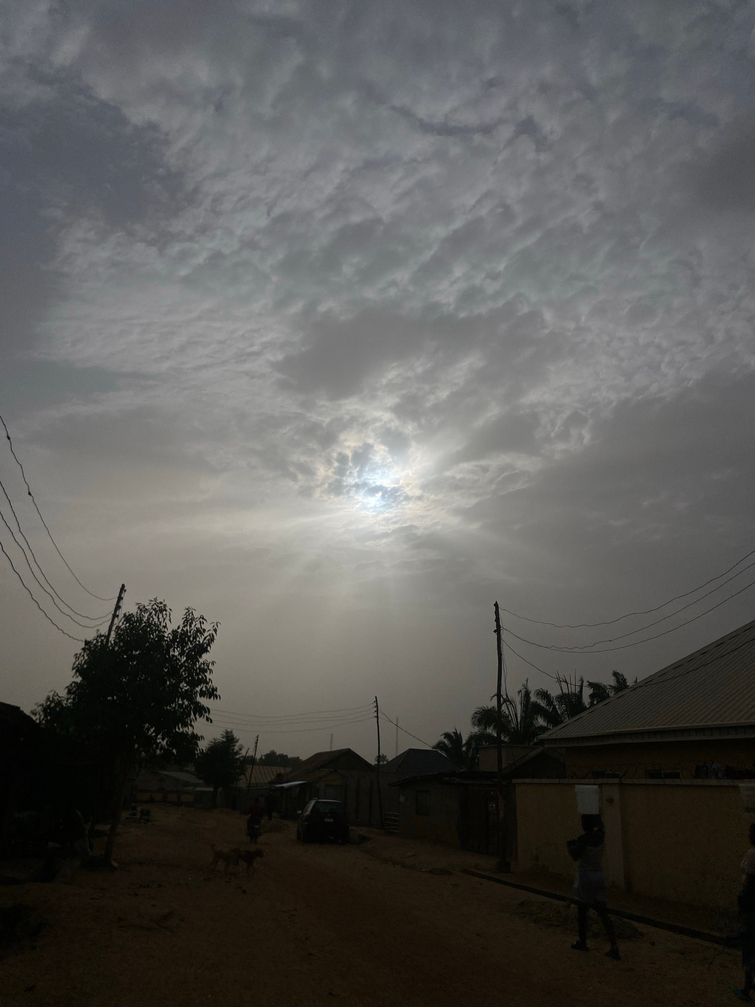 The image shows a street scene in Barden Yana, Nigeria, under an overcast sky with the sun partially obscured by clouds. A building with a corrugated metal roof runs along the right edge of the frame.…read more