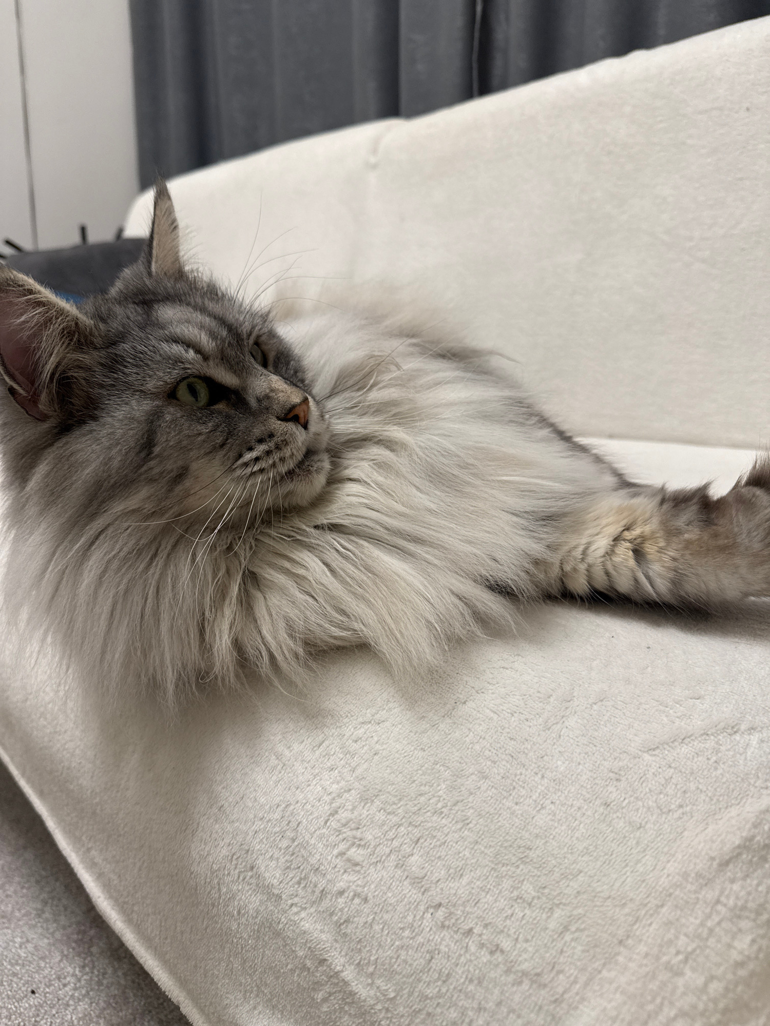 The image shows a silver tabby cat lying on a white, possibly plush, surface. The cat's head is tilted, with its green eyes visible. The fur is long and fluffy, typical of certain cat breeds like Mainβ¦read more