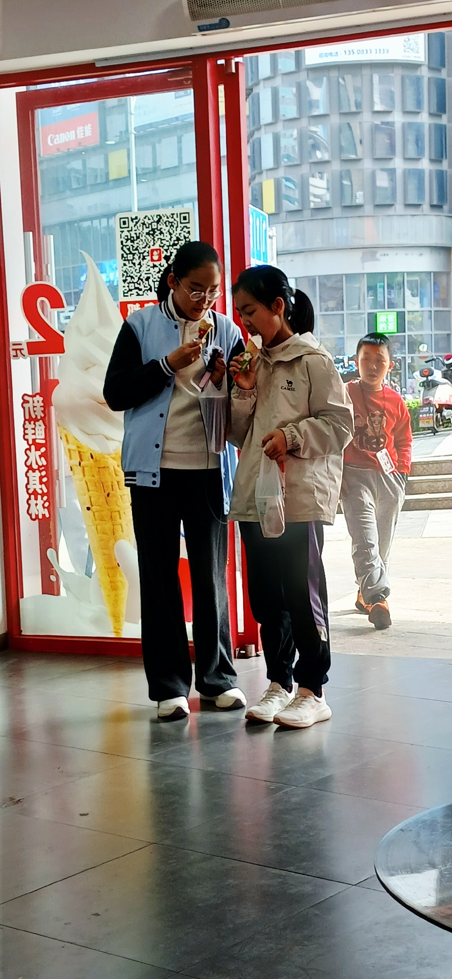 The image depicts three individuals in what appears to be an indoor commercial space. The person closest to the camera is wearing glasses and a blue and white jacket, holding what appears to be an ice…read more