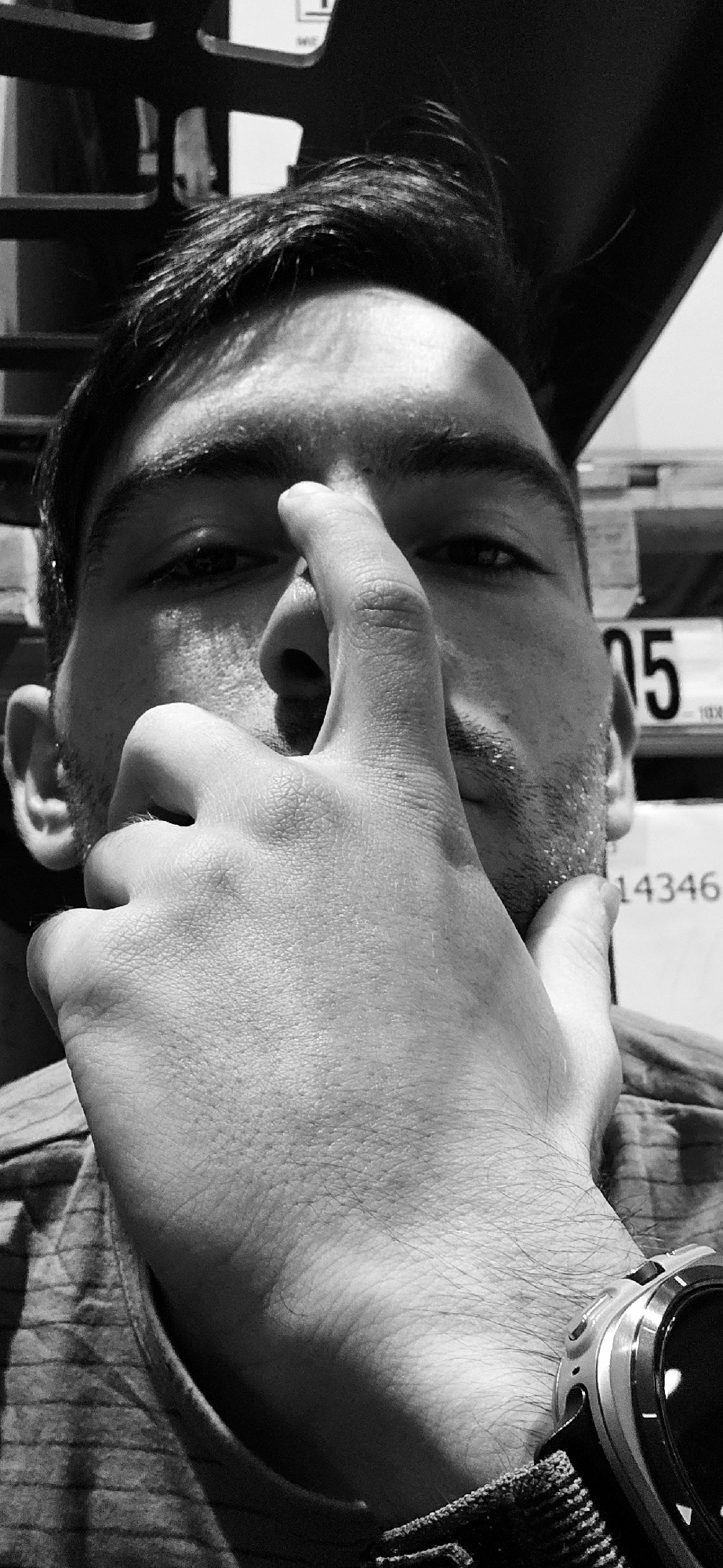 The image is a close-up, black-and-white photograph of a man, potentially in Plovdiv, Bulgaria. He is shown from the chest up, turned sideways. His left hand is raised to his face, with his fingers ne…read more