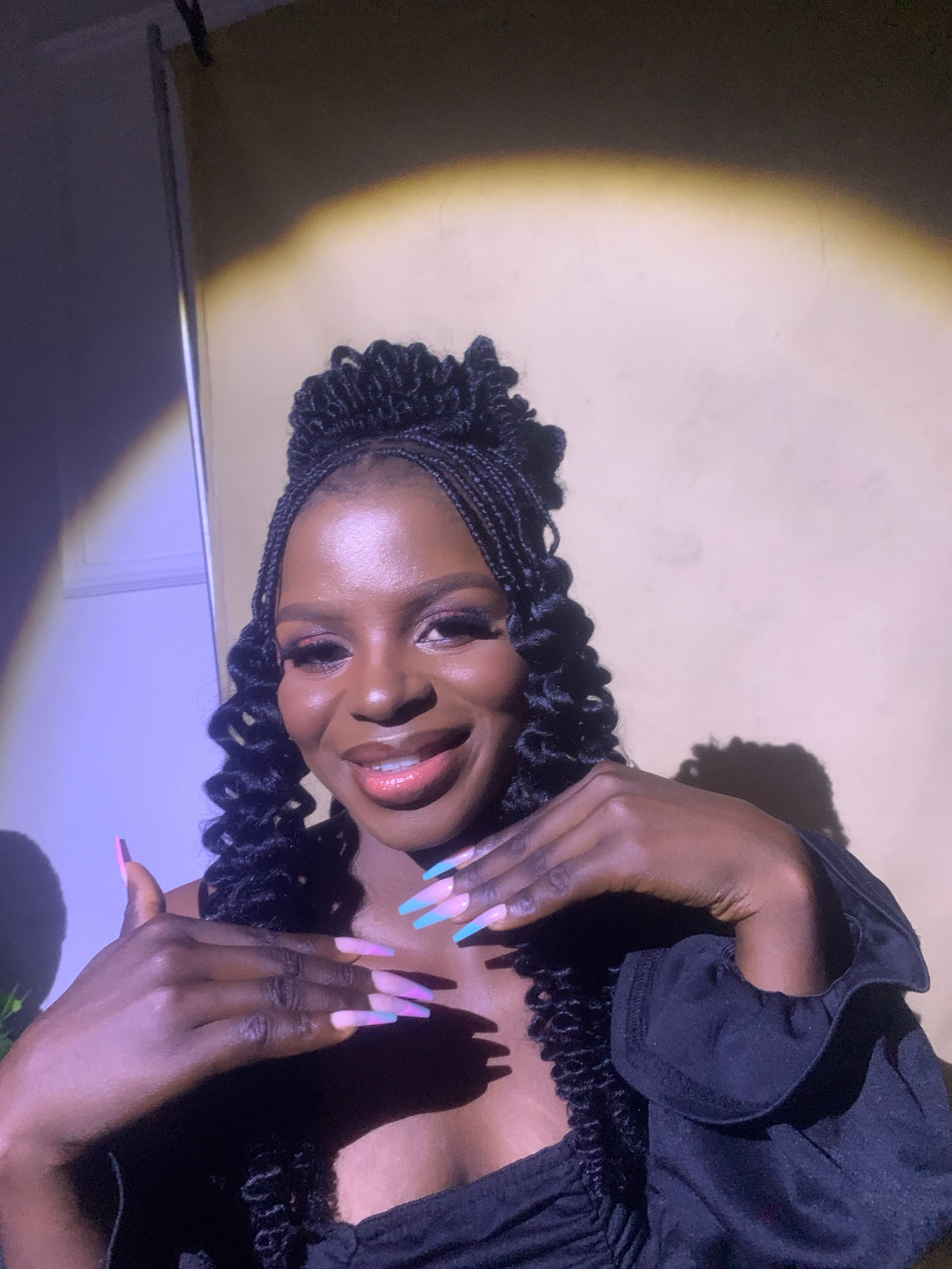 A young Black woman with braided hair is posing indoors. She is wearing a dark top with frills and has long, pastel-colored manicured nails. She is smiling. The lighting is uneven, with a bright spot…read more