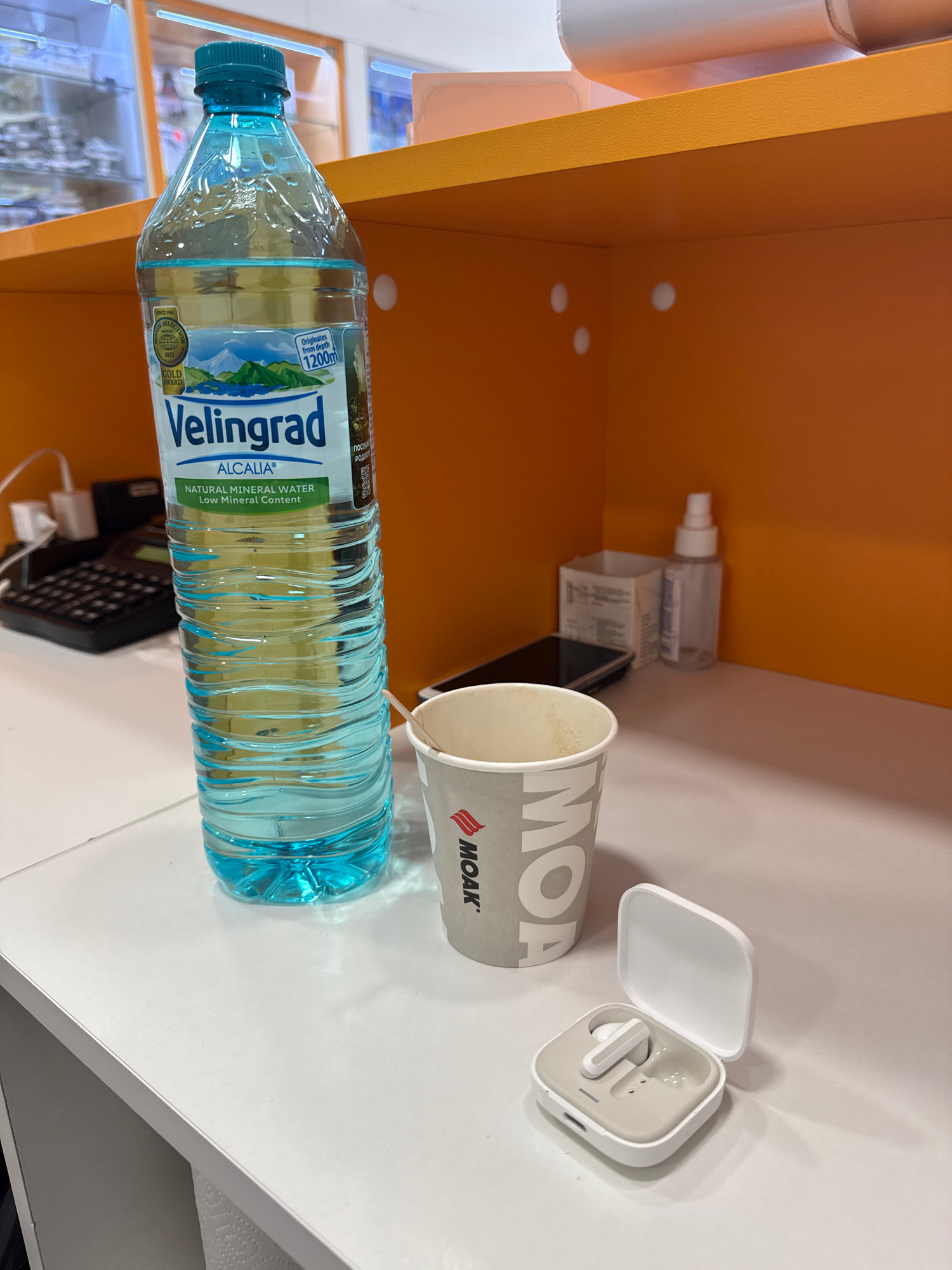 The image shows a still life arrangement on a white countertop, likely indoors. The objects present include a bottle of "Velingrad Alcalia" natural mineral water, a disposable coffee cup labeled "MOA,…read more