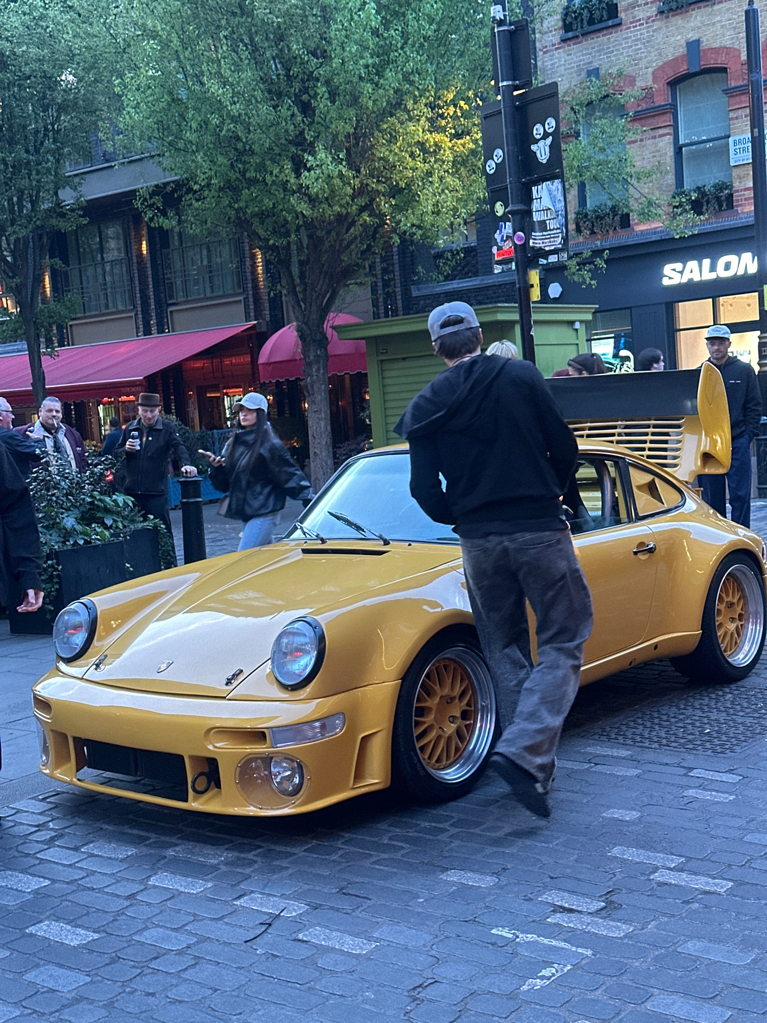 This evening street scene, set in London, United Kingdom, features a bright yellow sports car, resembling a classic Porsche 911 model, parked on a cobblestone street. Several individuals are gathered…read more
