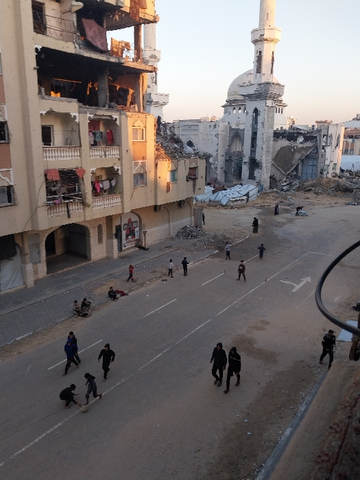A severely damaged urban landscape shows buildings partially collapsed and riddled with holes, indicative of heavy conflict. A mosque's minaret stands relatively intact amidst the destruction. People…read more