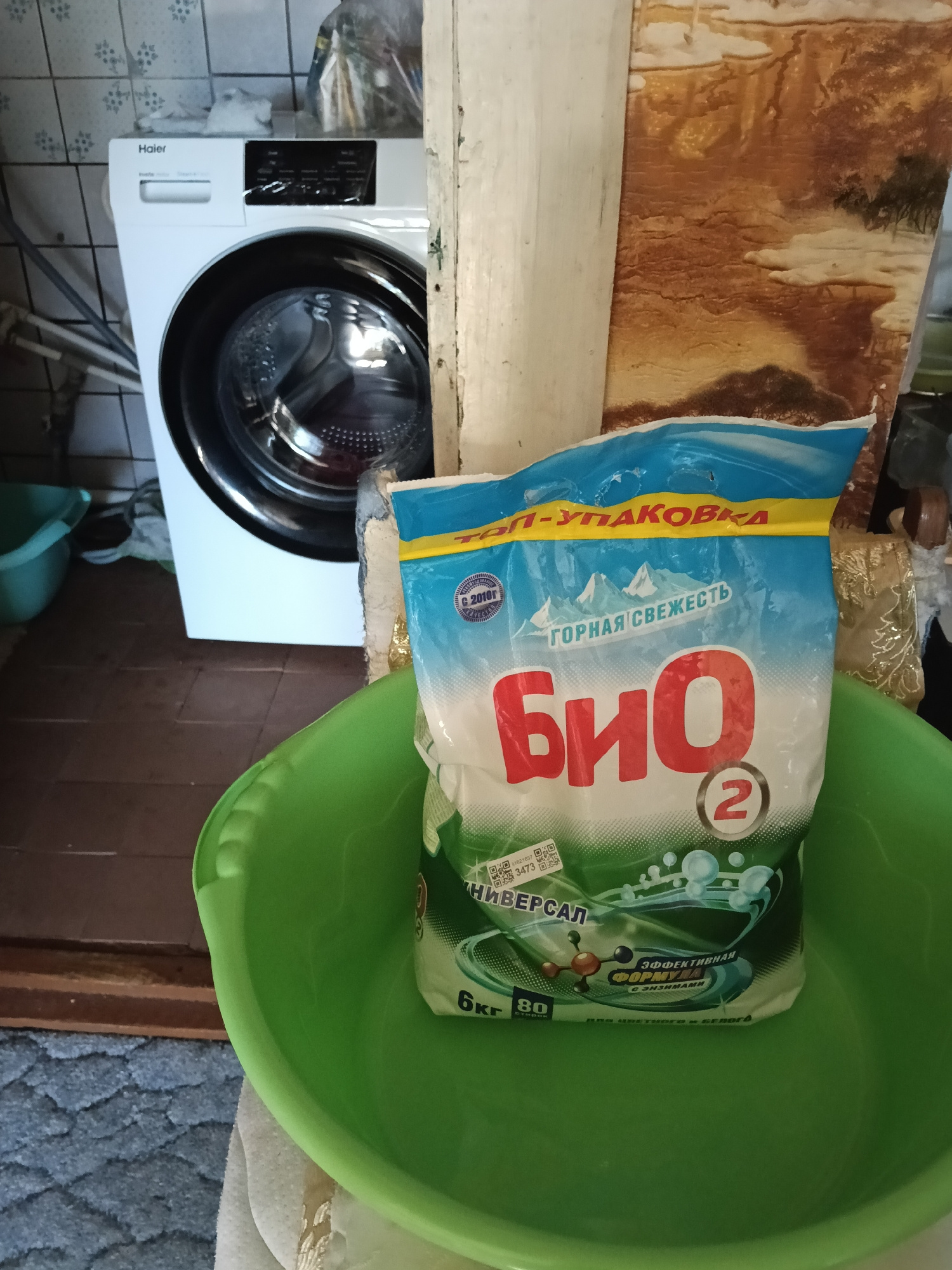 The image captures a domestic scene in Красный Маяк, Russia, presenting a Haier washing machine situated near an interior wall and a green basin containing a package of "BIO" washing powder. The washi…read more