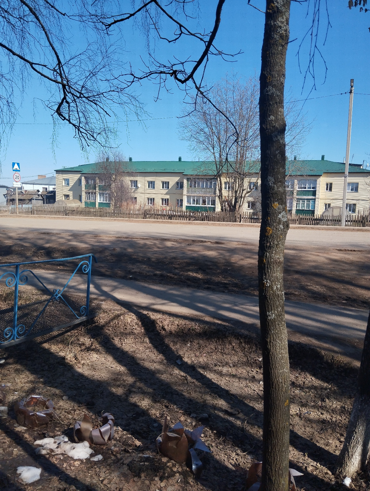 The image depicts a street scene in Krasnogorskoye, Russia. A two-story building with a green roof and yellow walls stands across the street, behind a wooden fence. Bare trees are present, with branch…read more