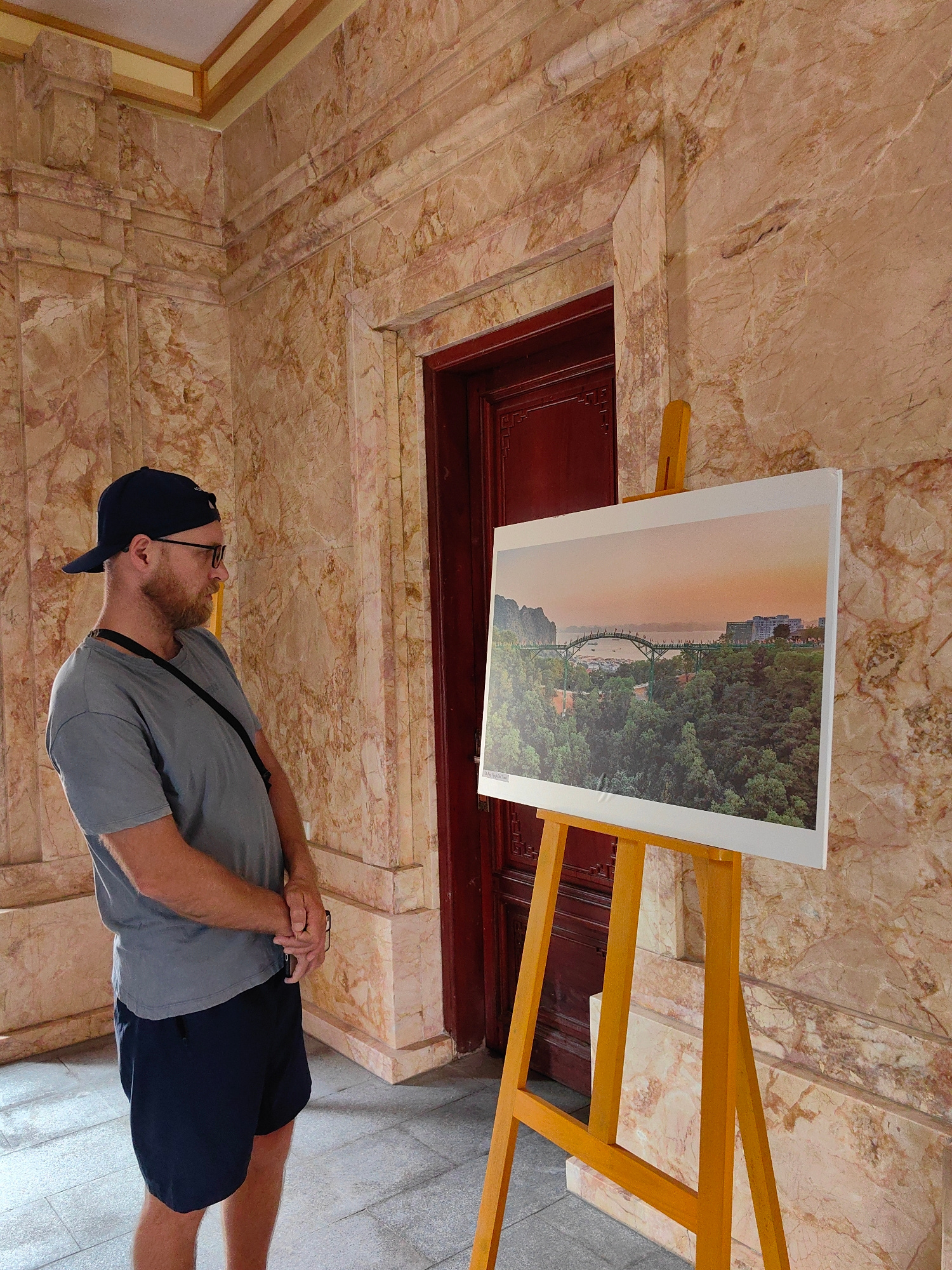 An adult male with light skin, a short beard, and glasses is standing in an interior space, looking at a photograph displayed on a yellow wooden easel. He is wearing a grey t-shirt, dark blue shorts,…read more