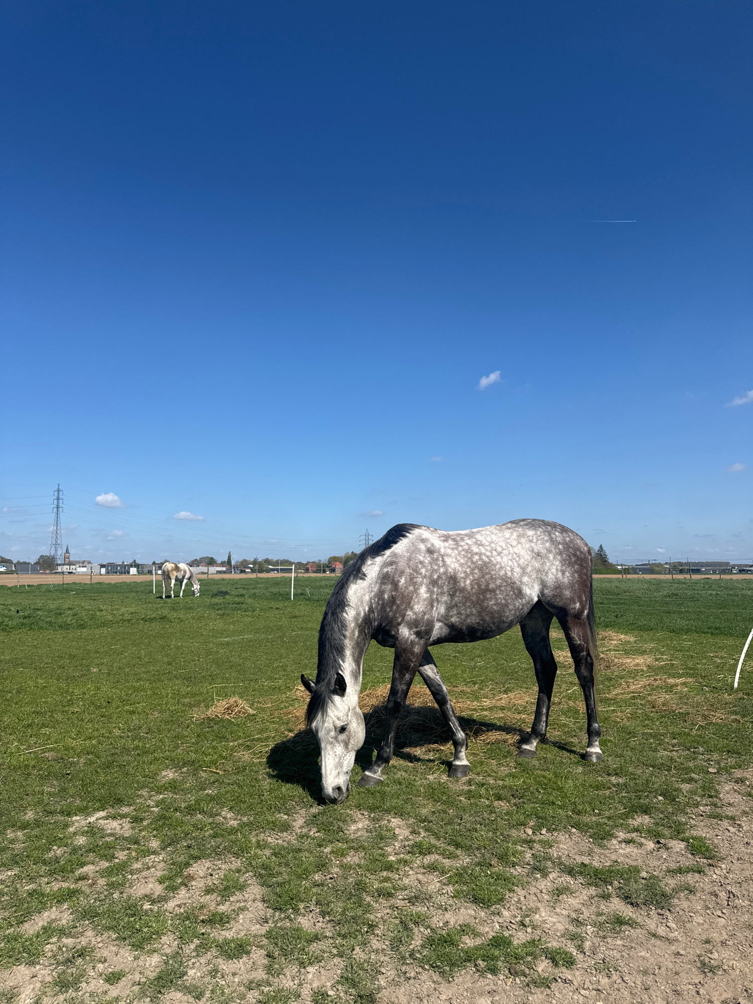 A gray dapple horse grazes in a green field under a clear blue sky in Estaimpuis, Belgium. Power lines, a small town, and two other horses are visible in the background. A contrail is high in the sky.…read more