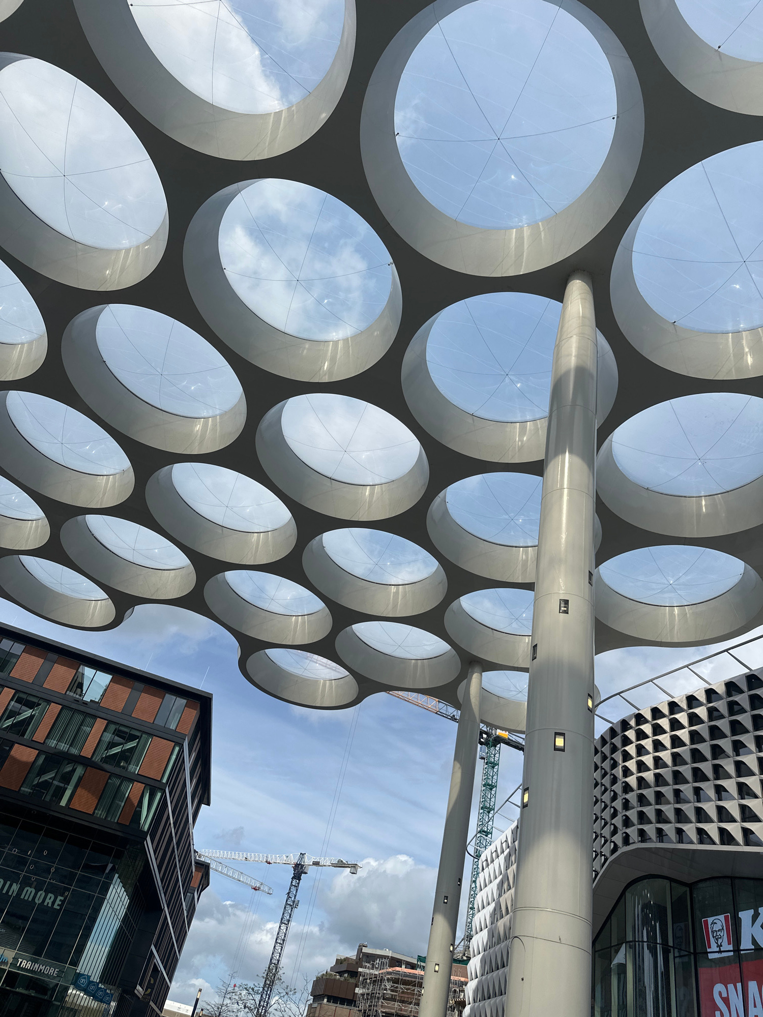 The image shows a low-angle view of the ceiling structure of Hoog Catharijne, a shopping center in Utrecht, Netherlands. The ceiling consists of a pattern of white circles, which are open to the sky,…read more