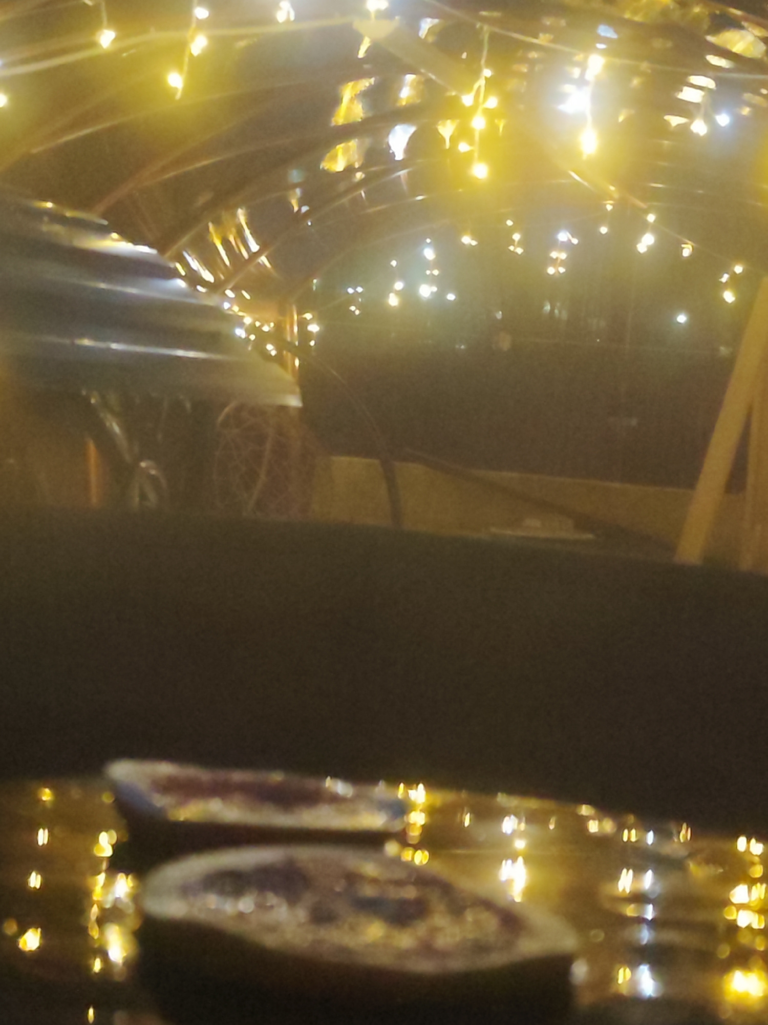 The image shows a blurry, low-lit scene with two small, round objects in the foreground, possibly food items with a reddish center and a light-colored crust. These appear to be sitting on a reflective…read more
