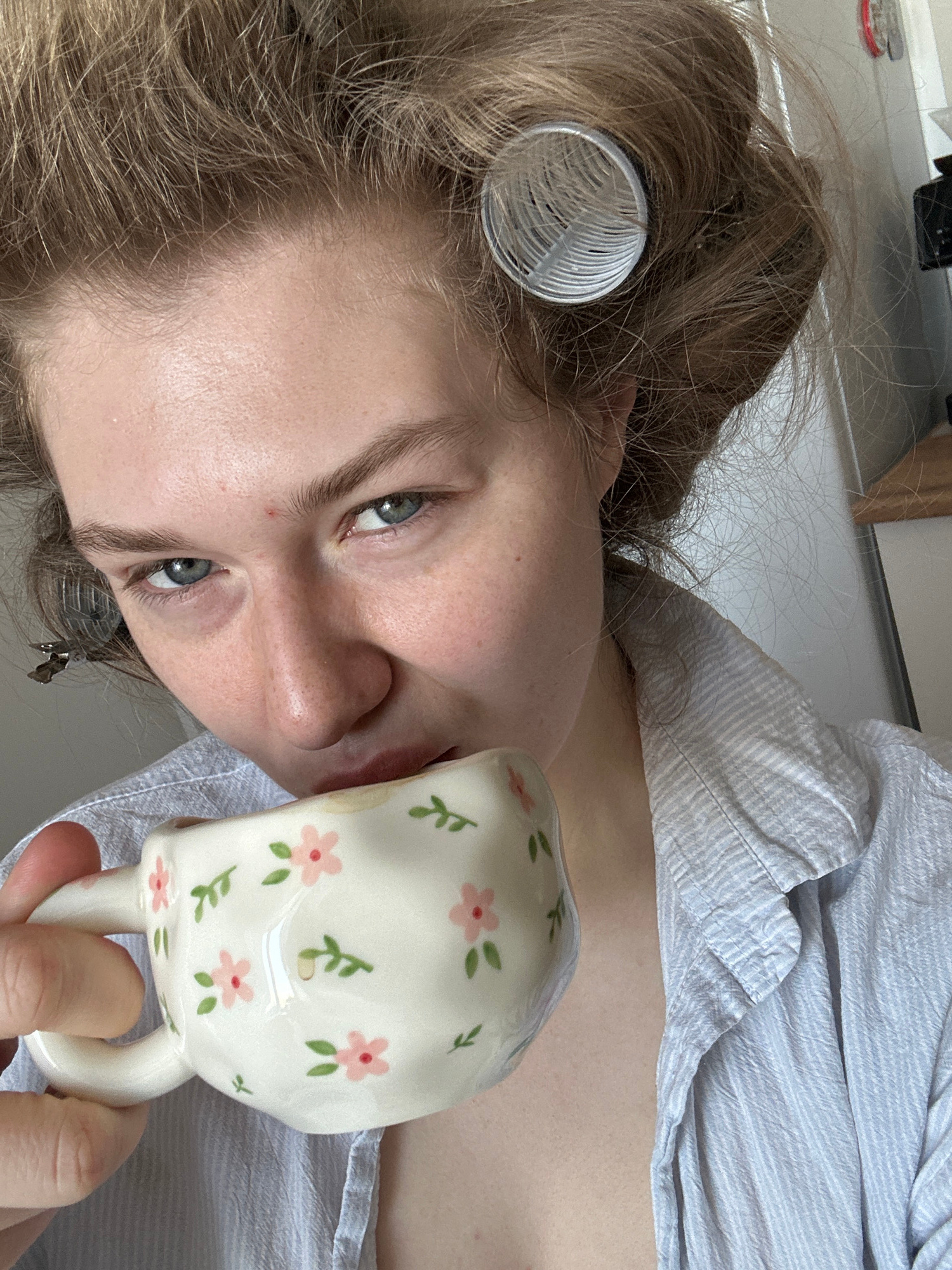 A young woman is shown in a close-up, slightly angled view, holding a floral-patterned mug close to her face, possibly drinking from it. She has light blonde hair with one visible hair roller on the l…read more