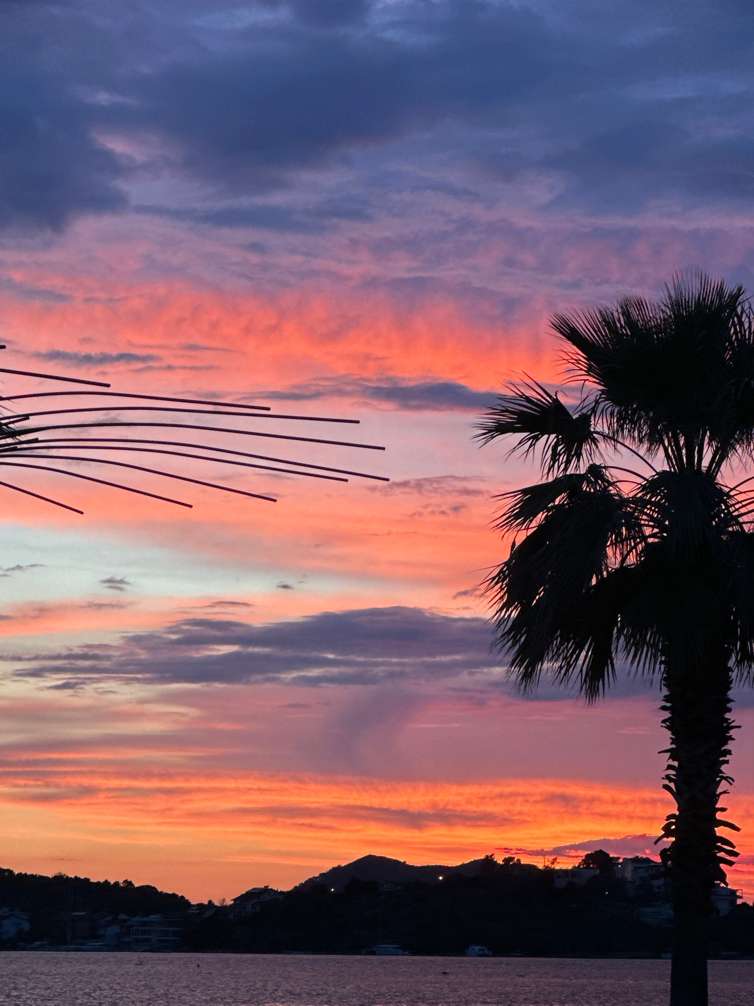 The image shows a sunset in Fethiye, Turkey. A silhouette of a palm tree is prominent on the left side, partially obscuring the sky. A series of thin, vertical lines, possibly part of an art installat…read more