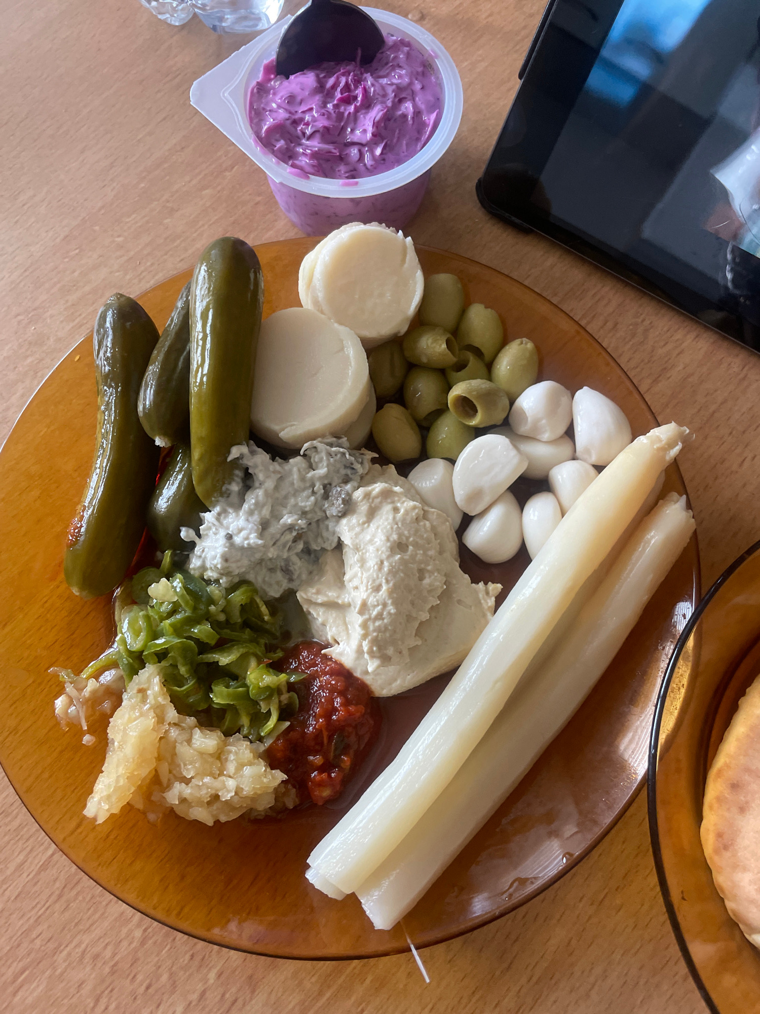 The image displays a meal set on a light-colored wooden table in Petah Tikva, Israel. The central object is an amber-colored glass plate containing various food items. On this plate, from left to righ…read more