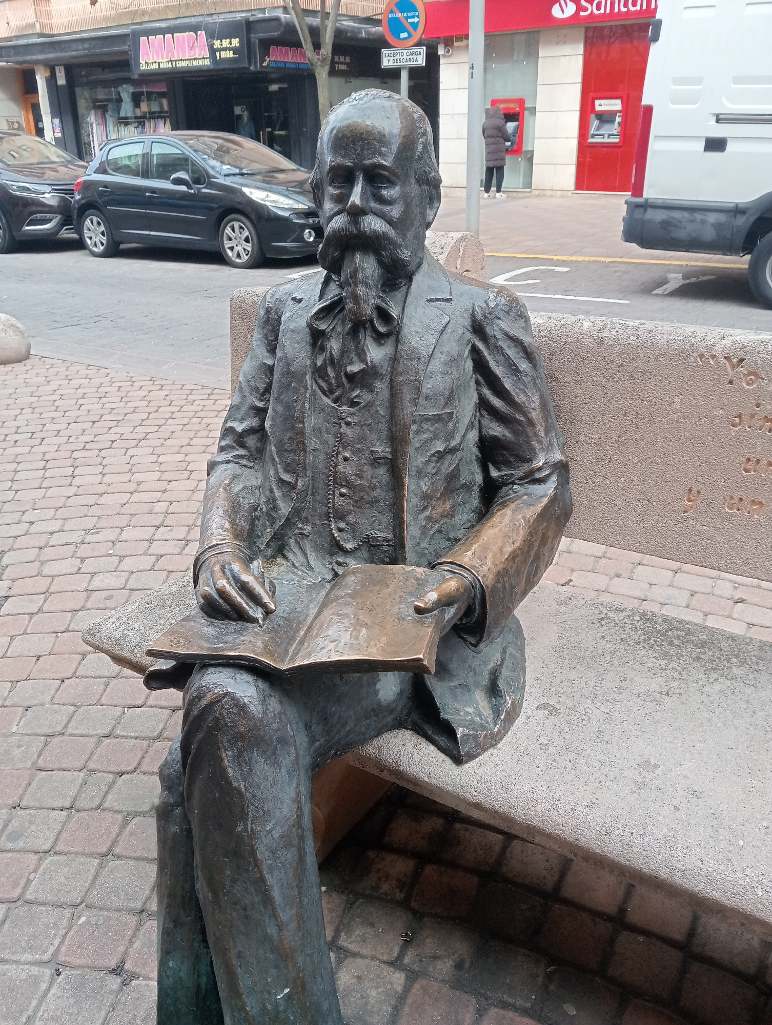 A full-body, bronze statue of a seated man occupies the center of the image. The statue depicts an elderly man with a long beard and mustache, dressed in a suit. He sits on a stone bench, holding an o…read more
