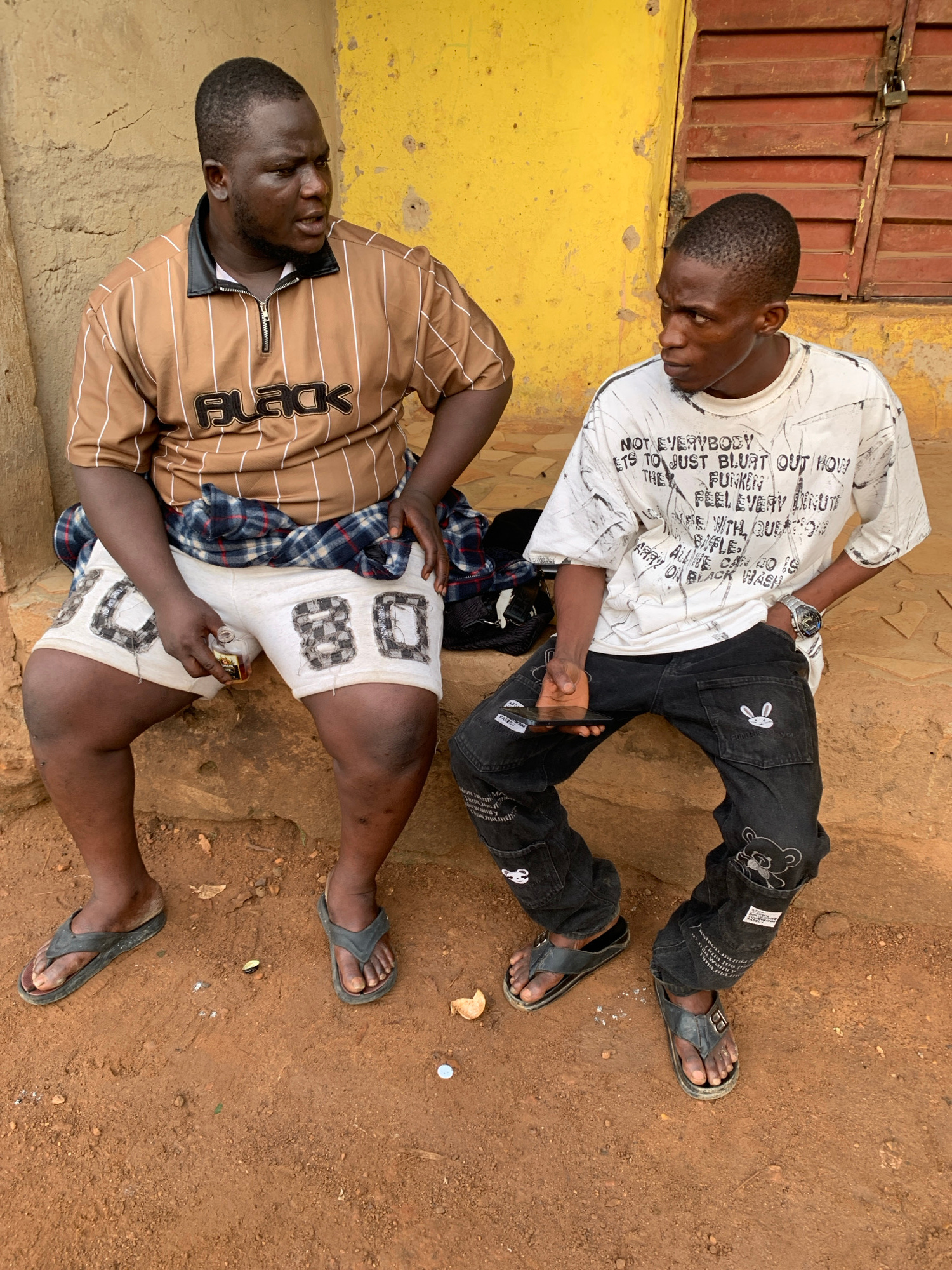 Two adult males are seated on a reddish-brown dirt ground in Akwanga, Nigeria, against a backdrop of a yellow-painted wall and a brown corrugated metal structure. The image appears to be taken during…read more