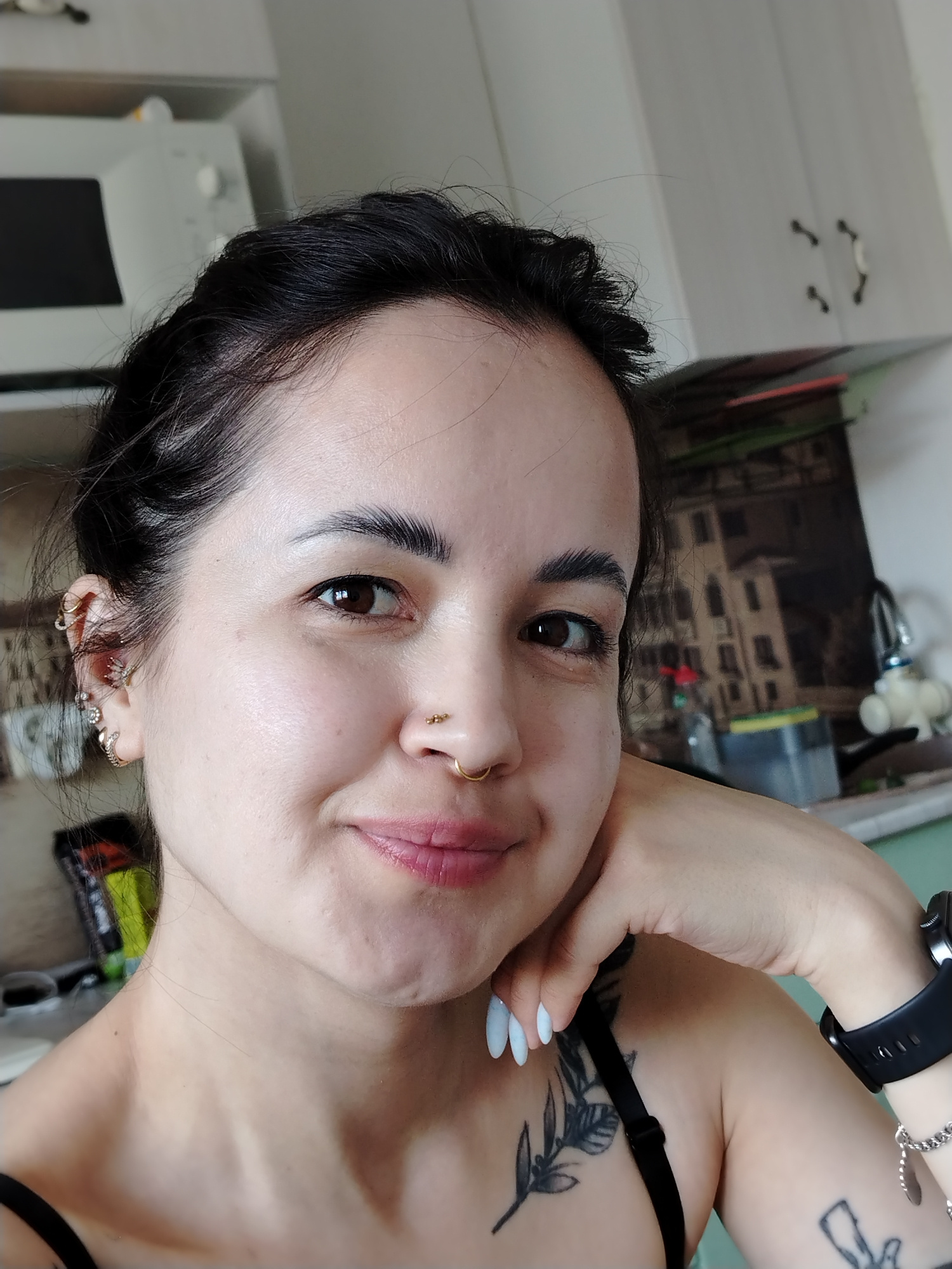 A young adult woman is featured in a close-up, eye-level selfie taken indoors. She has dark hair styled back, dark brown eyes, and a clear complexion, with a subtle, relaxed smile on her face. Her heaβ¦read more