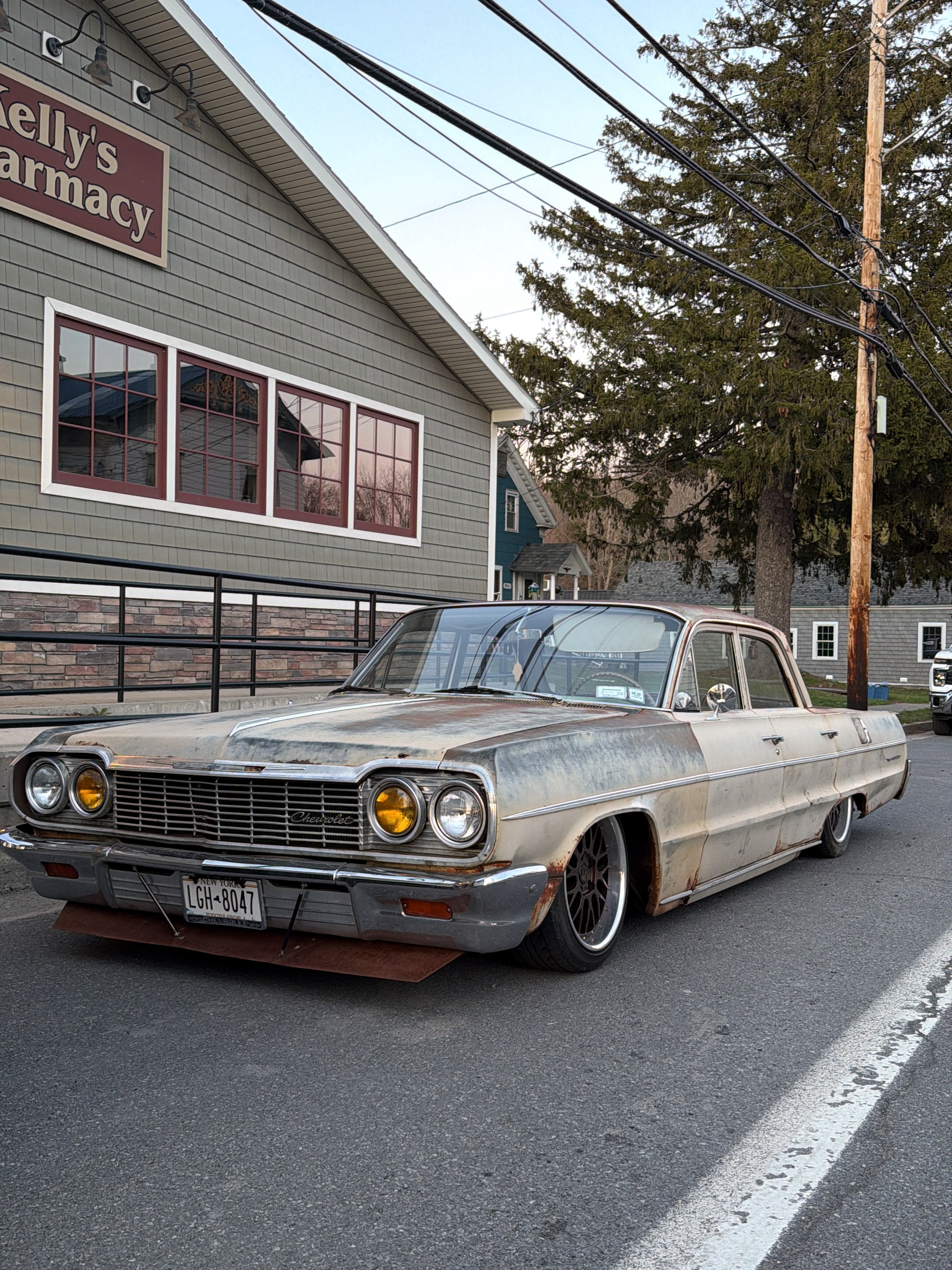 A heavily weathered, four-door 1964 Chevrolet Impala is parked on a residential street. The car sits extremely low to the ground, with aftermarket wheels. The vehicle's license plate reads "LGH-8047."…read more