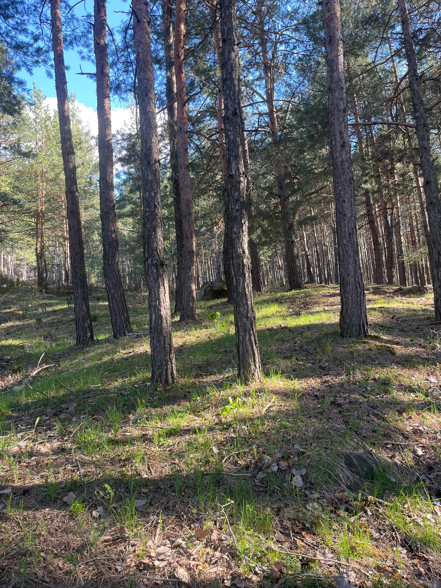 The image shows a forest landscape. Tall, slender trees with rough bark are aligned in rows, creating a sense of depth. The ground is covered in a mixture of dry leaves, grass, and vegetation. Light pā¦read more