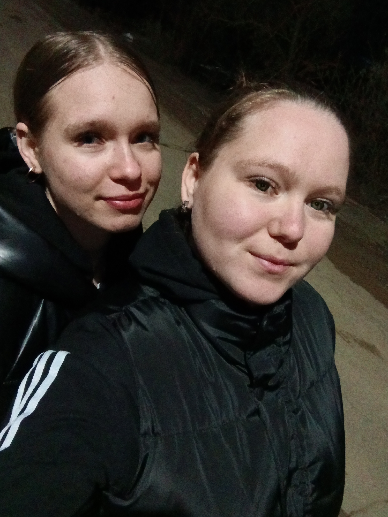 Two fair-skinned individuals are visible in the image. The person on the left has brown hair pulled back, revealing small hoop earrings. They are wearing a black hoodie with white stripes visible on t…read more