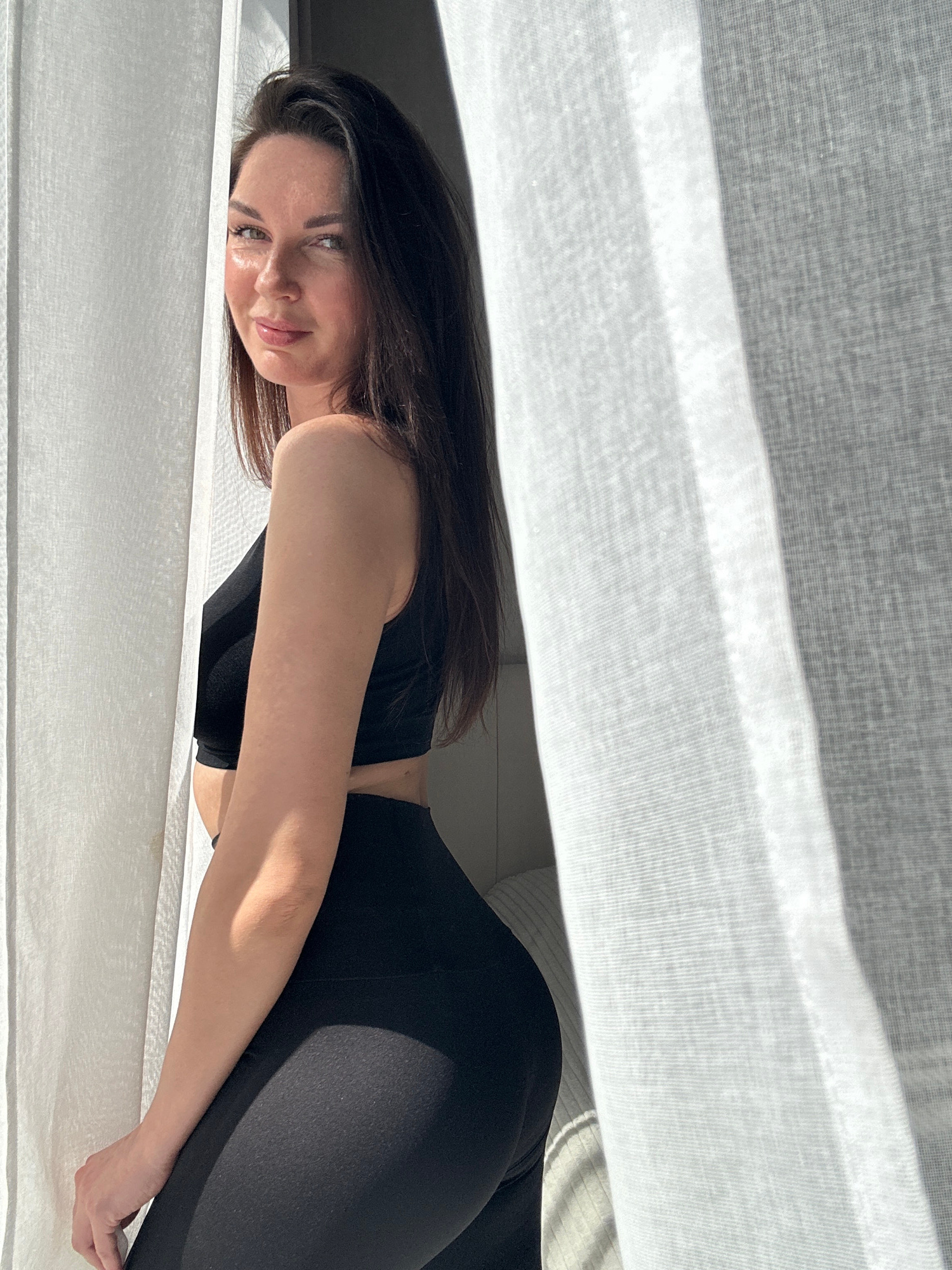 A woman is lying on a white surface, possibly a bed, covered with a thin white fabric. She is wearing a black top and leggings. Her hair is long and dark. The top of the frame is covered by a semi-tra…read more