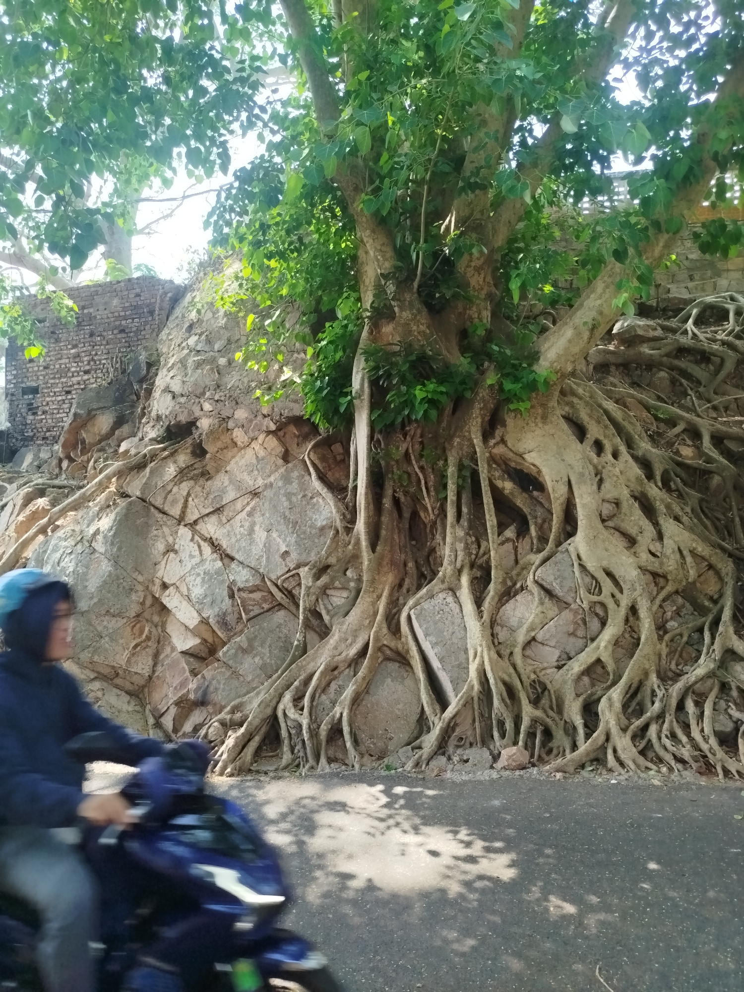 A tall tree with extensive exposed roots grows atop a rock wall alongside a road. The tree's roots intertwine and cover a large portion of the rock face. Some greenery is visible at the top of the wal…read more